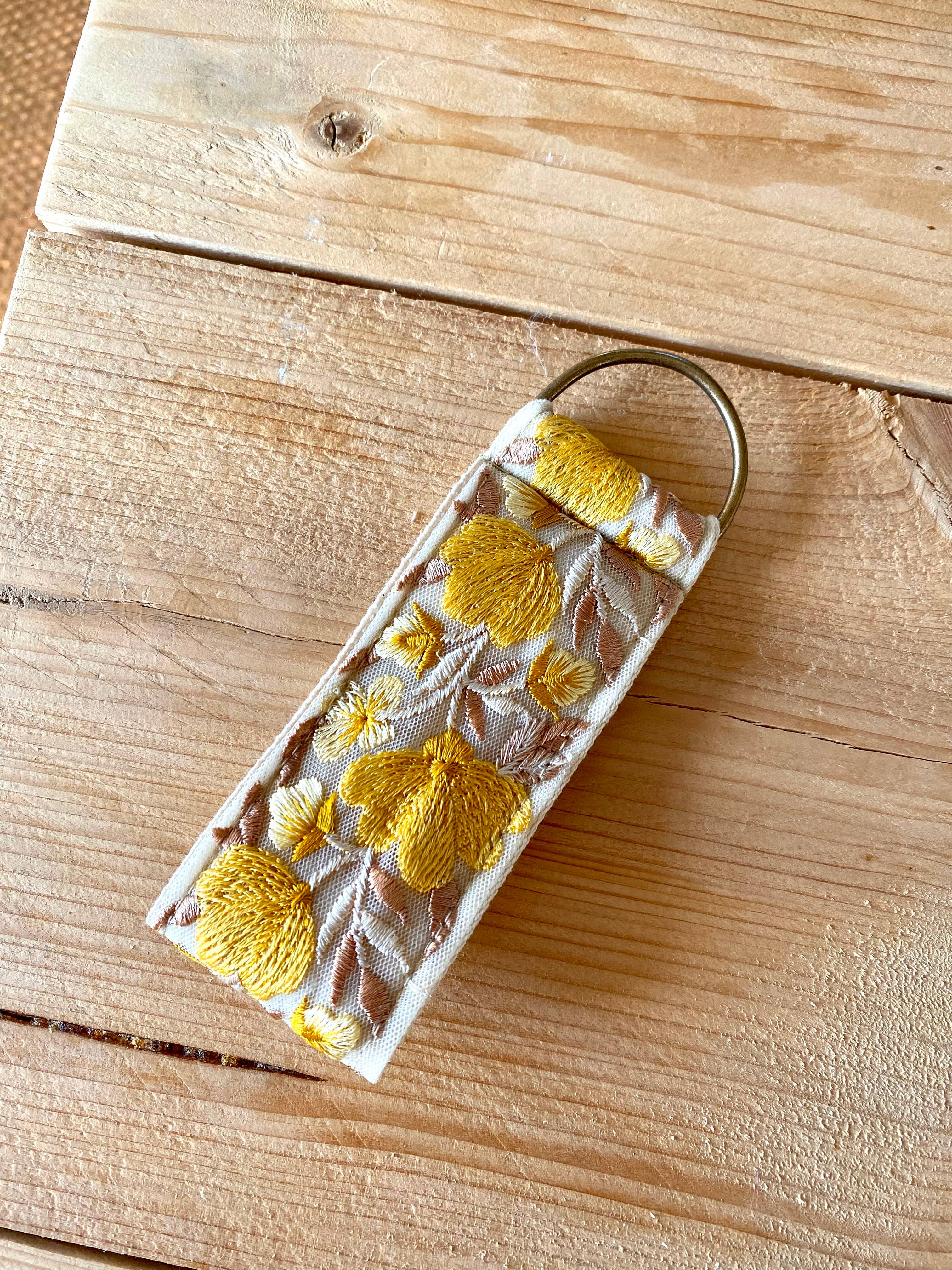 Keychain Collection This ultimate gift is perfect for a family member, loved one or yourself to treasure. They are unique which makes it a show stopping gift on Birthdays. These keychains are all handmade from floral silk embroideries, each having there own unique floral pattern. They are also ideal to keep on your wristlet while unloading your groceries or need to keep your hands free. If you like to give something fun for a birthday party try these whimsical keychainsy charms. Beautiful gift idea for bridal showers, housewarmings or for a new car, house, apartment! All key favors are cotton based and come with a bronze metal d-ring. One of them had a silver one, however I do custom boxes, so fill free to ask for a different color D-ring or a hook! Measurements: 14 cm long 5cm width Color: Inside is cream white #wristletstrap #keychainring #fabrickeychain #floralkey