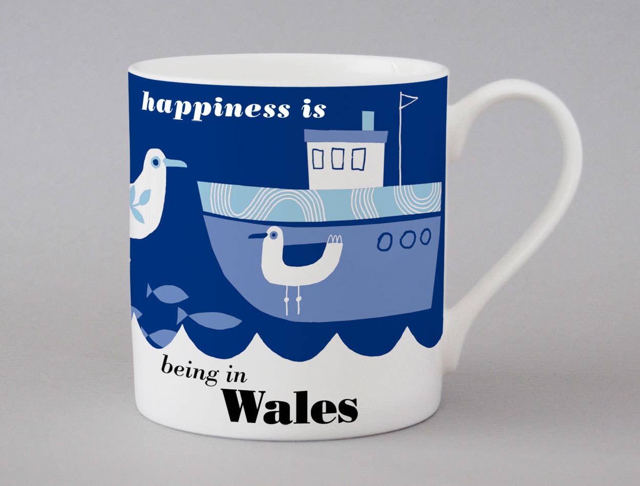 Our Pavilion range of bone china mugs celebrates towns, cities and regions with a design referencing the mid-century style of The Festival of Britain. A great Welsh gift for anyone who loves Wales. Height: approx 88mm Capacity: 350ml Large Bone China Mug (Non UK): We decorate this bone china mug here in Stoke-on-Trent, but the mug itself is made outside the UK. Design: Gillian Naylor and Mark Faulkner @ Repeat Repeat Dishwasher Safe: We recommend mild liquid detergent rather than the abrasive tablets and powders. Microwave Safe: Yes