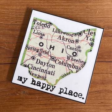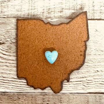 Spread the Ohio love far and wide with a handcrafted magnet! Laser cut wooden magnet in the shape of Ohio engraved with the words 'Someone in Ohio Loves You' in our signature handwritten font. • Made of hand-painted 1/8" baltic birch plywood. • Available in our array of colors including Natural, Purple, Red, Aqua, Olive, Mustard, Light Pink, Sage and Teal. • Super-strong rare earth magnet. • Magnet measures approximately 2.2" x 2.4". • Unpackaged