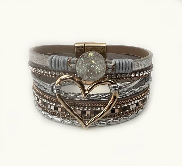 Boho Layered Design Crystal stone and heart shape Convenient Magnetic Snap Inner bracelet diameter 6CM, width 2.5CM Weight 30G Material: Leather, Alloy, Rhinestone