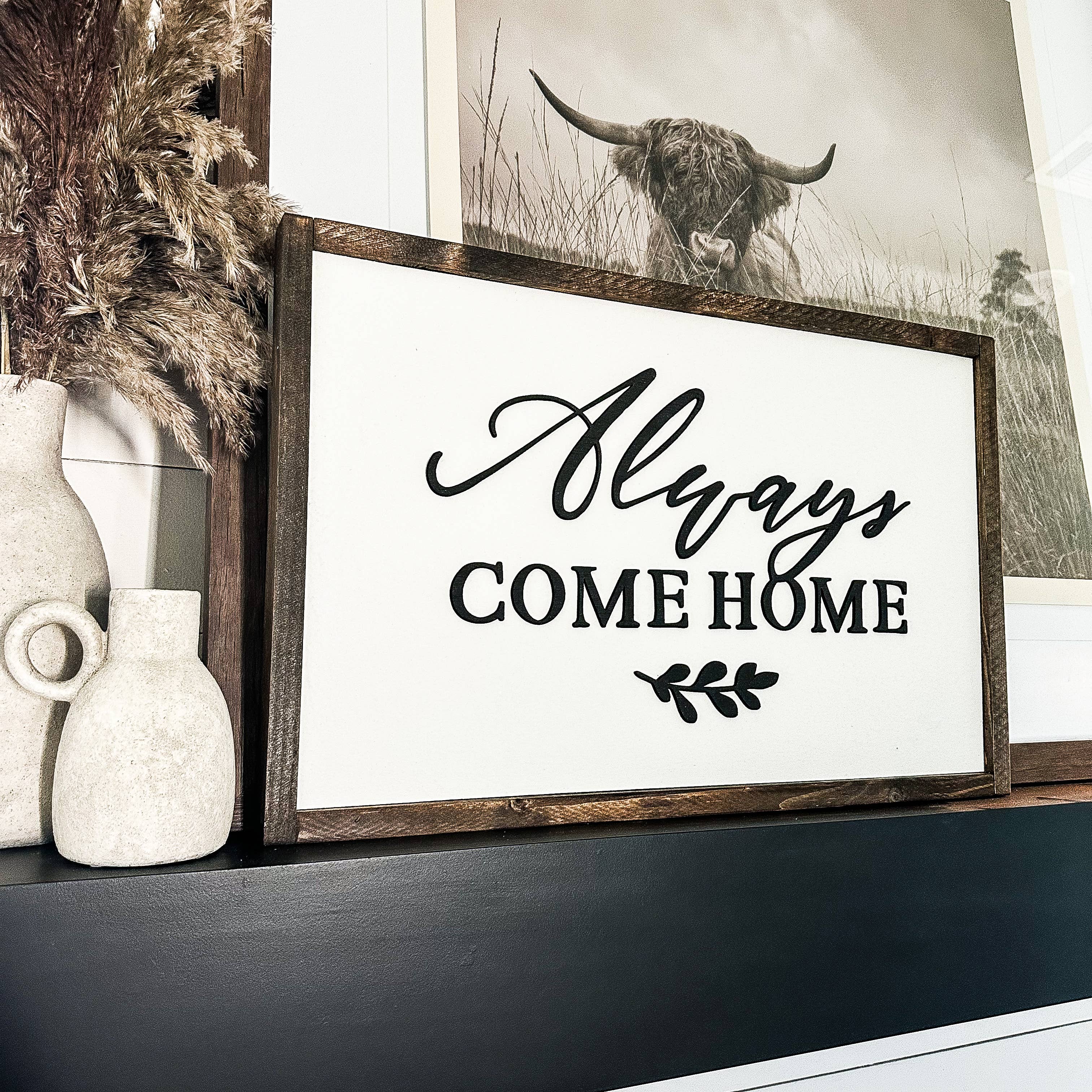 BACKGROUND: White LETTERING: Black FRAME: Classic Gray 🌲Each sign is hand painted, screen printed with ink, and/or laser crafted with 3D lettering. 🌲3/4" MDF used as the backer. 🌲Backs of signs are unfinished, and will have a Dakota + Pine Design Co. stamped logo 🌲Signs may vary slightly in size, but never more than 1 inch. 🌲All signs come sealed and ready to hang. If it is a framed sign, the frame creates an overhang for easy hanging.
