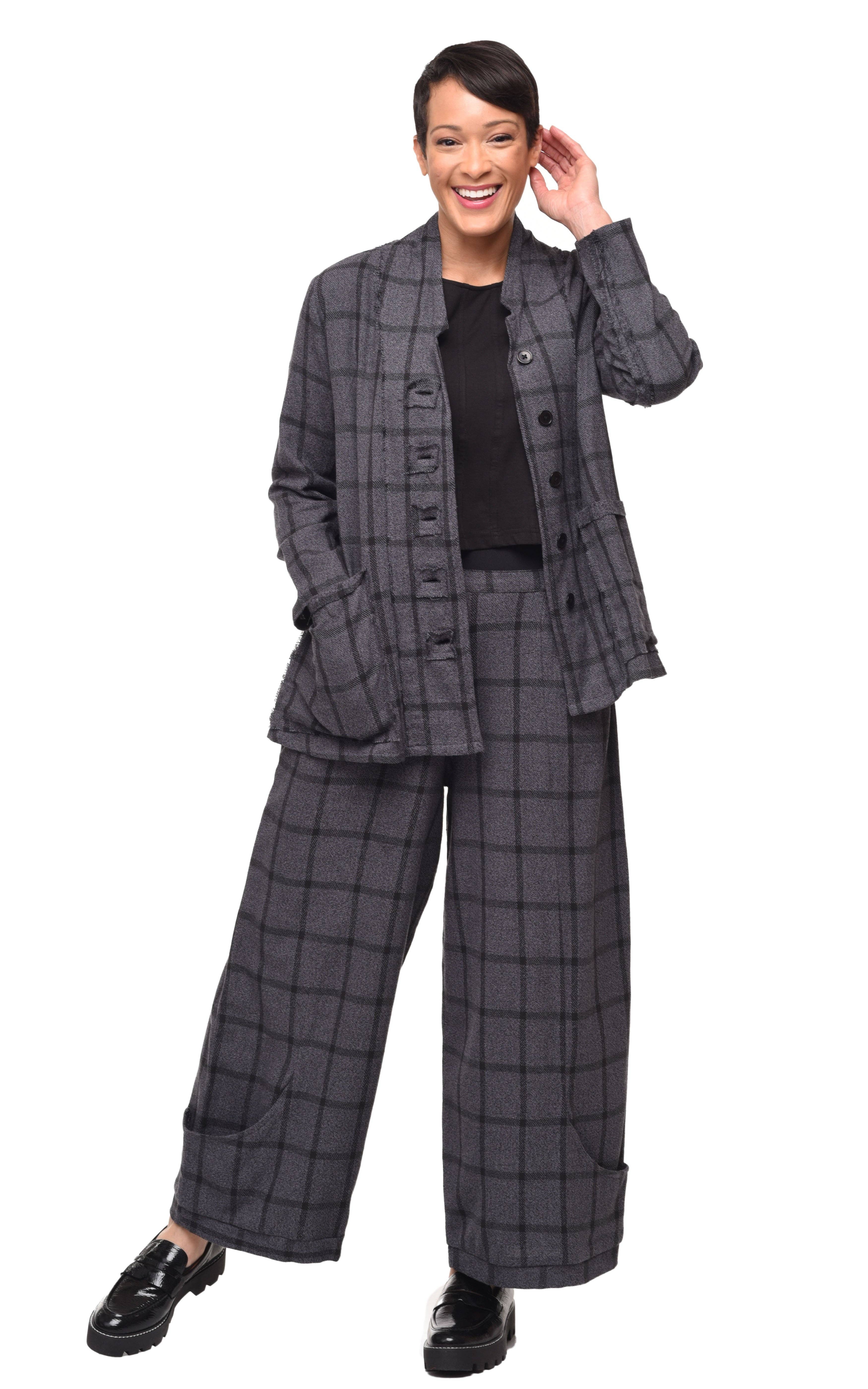 Ankle-length pant featuring a flat-front and elastic back waistband, with a side button entry for easy fit. There is a decorative patch pocket on one knee with trimmed raw finish. * Inseam 27" * Waist Relaxed: XS 12 1/2", S 13 1/2", M 14 1/2, L 15 1/2", XL 16 1/2" * Waist Stretched: XS 13 1/2", S 14 1/2", M 15 1/2", L 16 1/2", XL 17 1/2" * 95% cotton, 5% spandex * Machine wash. Hang to dry. * Model is wearing size small.