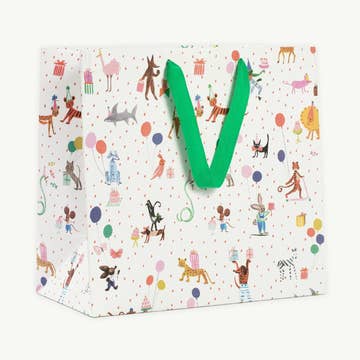 The new "Funky Cats" design now in an easy to use gift bag! Add a piece of white tissue paper and check 'wrap a gift' off your to do list. These bags are gorgeous! They are constructed using heavyweight card stock and printed in full color with patterns that go around all sides of the bag. The base is reinforced with an additional piece of glued in cardboard to add strength and stability. - 13" tall x 9.5" wide x 4" - Green reinforced rope handles - Full bleed printing - Made in USA by a small business