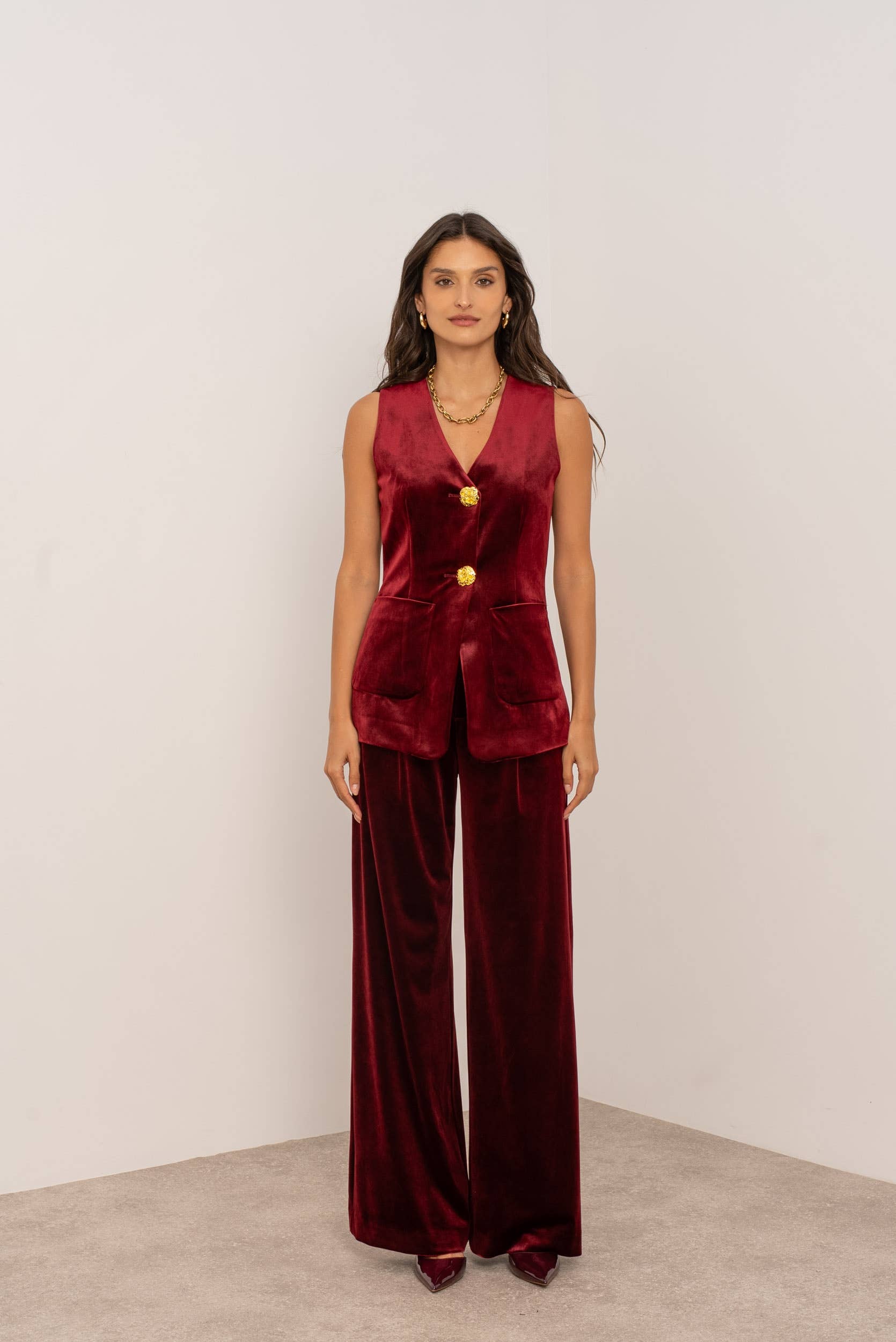 Sleeveless vest. Round neckline and fitted cut for a structured silhouette. Closure with five textured gold buttons in a jewelry style. Flap pocket detail on the front. Slightly flared length with a center slit at the hem. • Heather Collection: Can be worn with pants P2580, P2582, shorts ST2546, ST2595, skirt JP2587, jackets V2579, V2581, V2598. • Sold in a pack of 4 pieces Sx1 Mx1 Lx1 XLx1 of the same color.