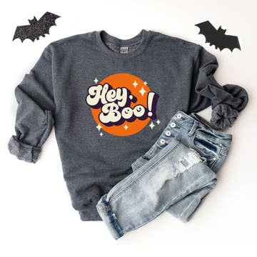 Get ready to shine this Halloween with our Hey Boo Stars Graphic Sweatshirt! This adorable and trendy design features stars and the playful phrase "Hey Boo." 0340 Fleece Sweatshirts: White, Charcoal and Black are 80/20 cotton/poly, Heather Grey and Heather Denim are 50/50 cotton/poly, our sweatshirt ensures comfort and style throughout the fall season. Embrace the Halloween magic with this delightful sweatshirt and captivate your customers with its charming appeal. By Kissed Apparel.