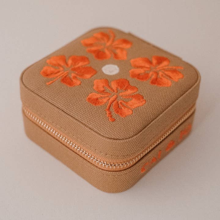 Keep your jewellery safe with our travel jewellery cases! Embroidered with an original cai & jo design, these make for the perfect way to take your jewellery on a weekend trip without it getting tangled or lost in your bag! • Measures 10x10x5cm •Includes internal pouch •Imported