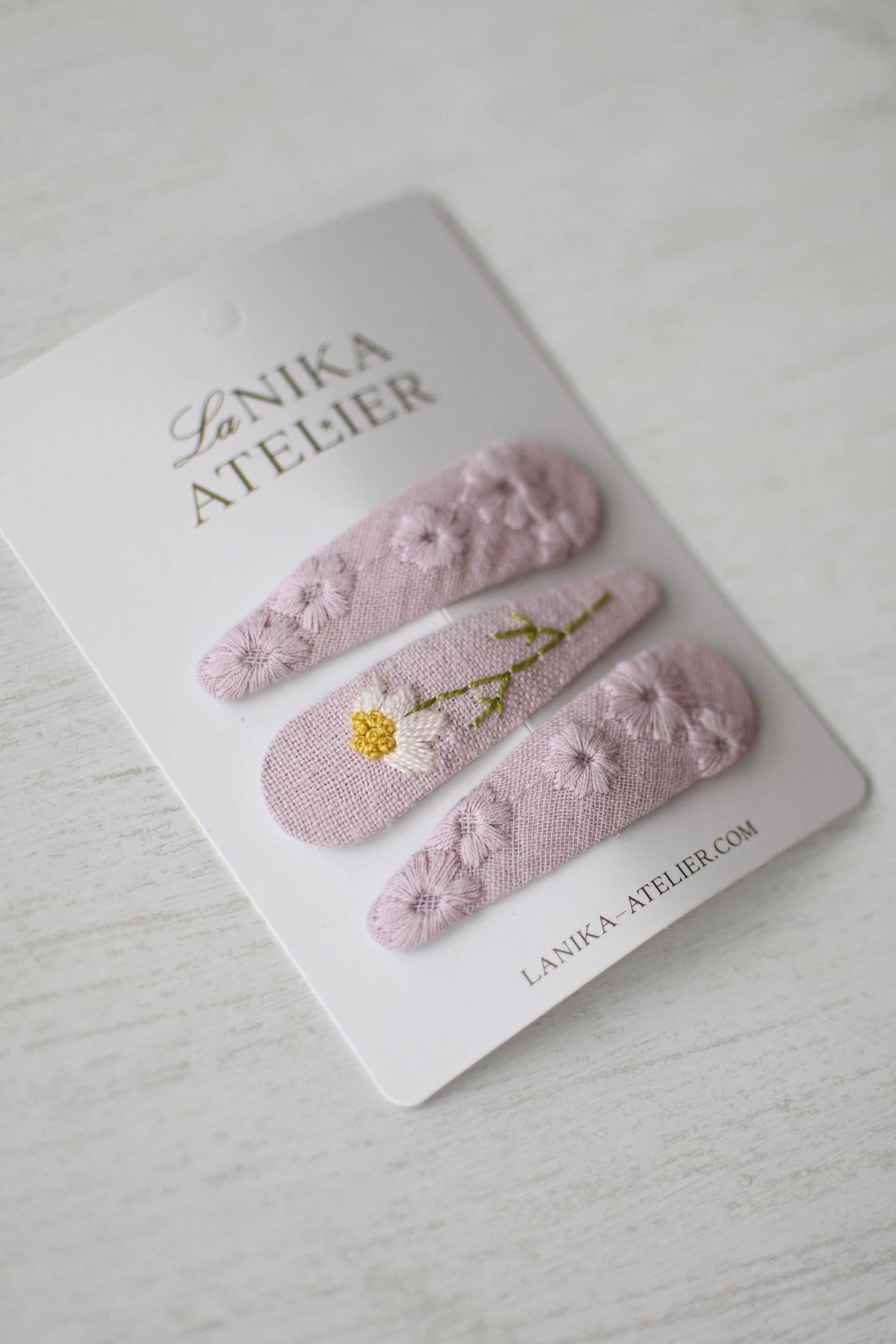 Tired of flimsy hair clips that just won't stay put? Fed up with constant hair accessory adjustments? Looking for something special yet perfect for everyday wear? Your search is over. Our handmade, hand-embroidered hair clips crafted from soft, no-pulling linen and cotton fabric scraps are here to solve all your hair clips problems. KEY FEATURES: - made from fabric leftovers (material: linen/cotton) - soft (felt on the back) - baby first hair snap clips (5cm) that hold the hair very well They hold the hair very well. Completely covered in fabric. They are soft and do not pull the hair. Each little clip is slightly different, the picture is symbolic. The price includes two hair clips on cardboard. They are suitable for babies, toddlers, kids, teenagers and adults. Use and Care Gently slide the clips into your hair for a secure and stylish hold Store the clips in a dry place, they may rust if they come into contact with water or saliva.