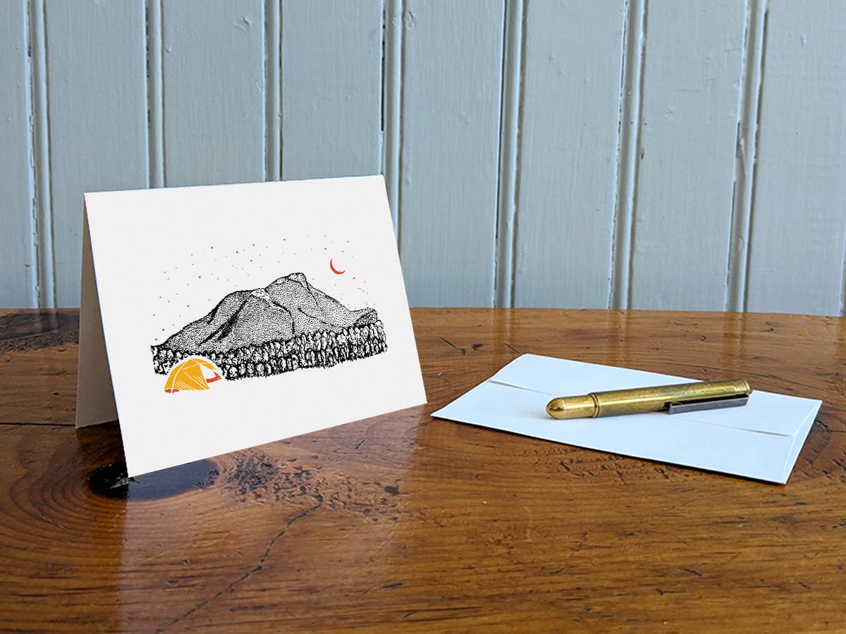 This greeting card features an adventure dog enjoying a colorful sunset with a hand-illustrated mountain in the background. Greeting card is blank inside and perfect to write a special note to friends and family. This A2-size card measures 5.5 x 4.25 inches and is printed on thick, responsibly sourced paper that is 100% post consumer recycled paper. Card comes with a white envelope and it comes packaged inside a clear, plant-based PLA sleeve that is certified compostable. To give back to the wild places we love, we donate at least 1% of our sales to organizations dedicated to environmental conservation. We are proud to use recycled and responsibly sourced materials to create our products. Made in USA.