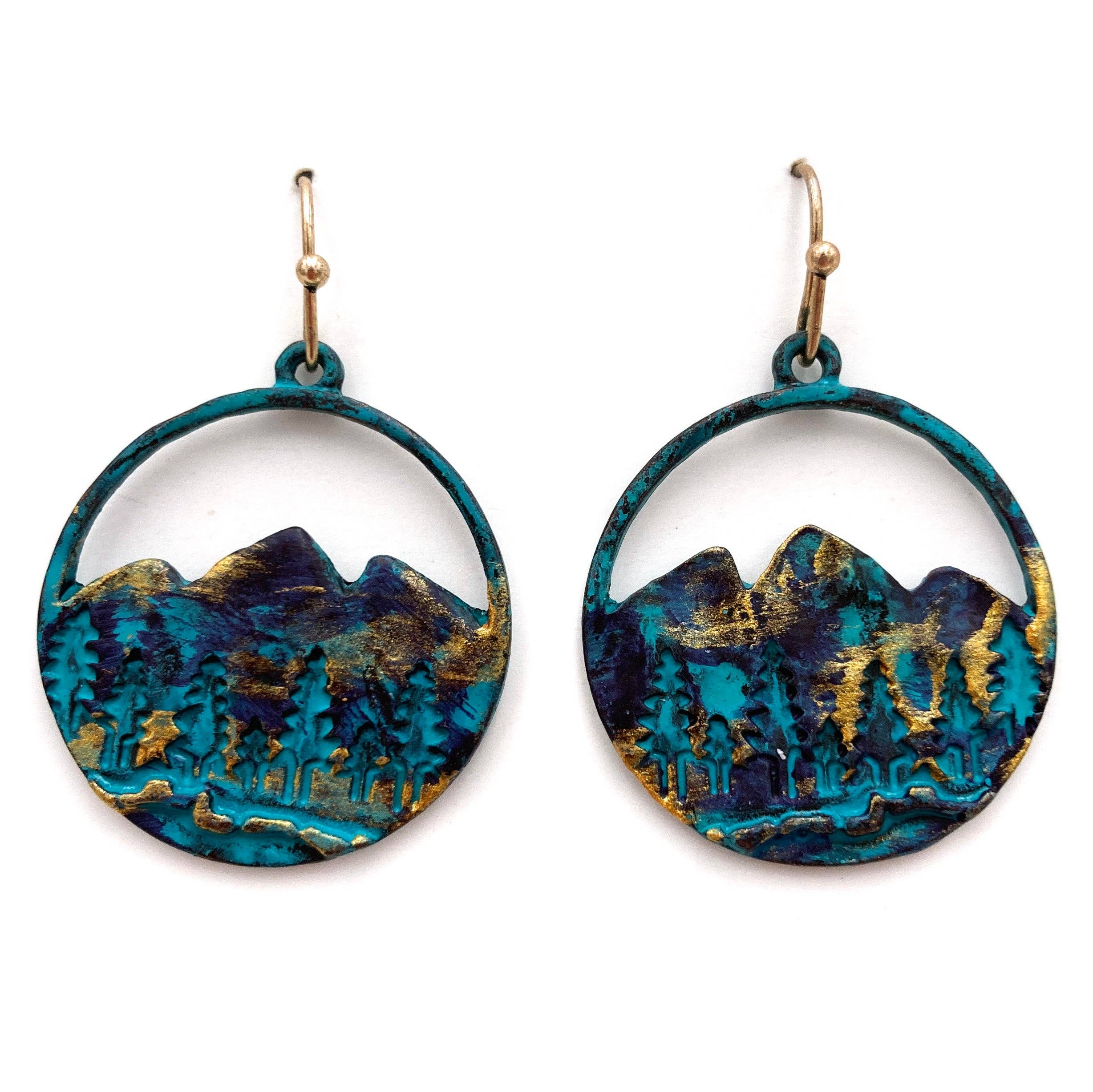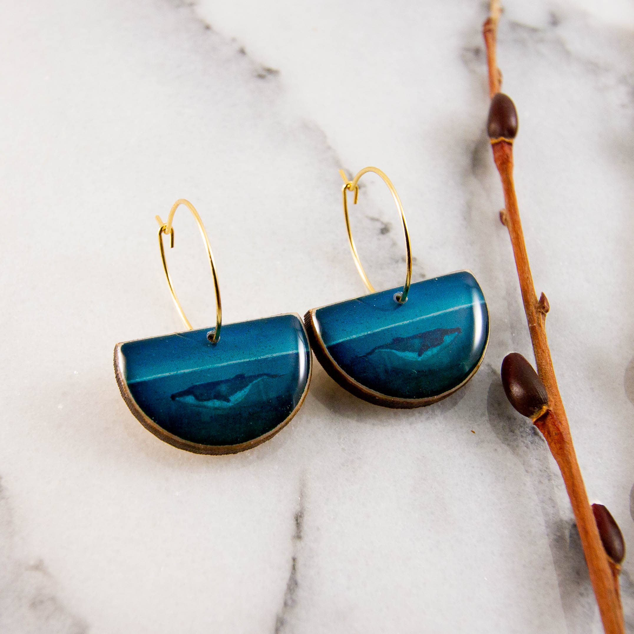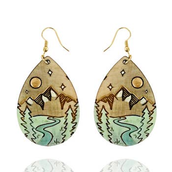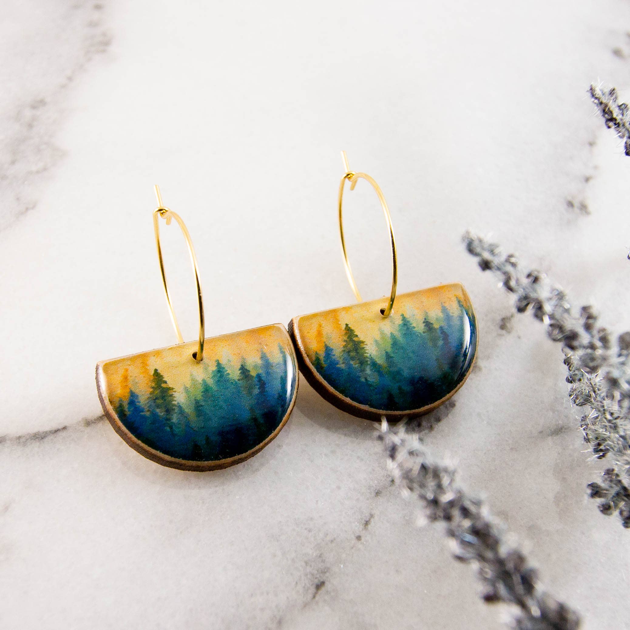 These earrings are a celebration of nature! Featuring a watercolor forest illustration, rendered in shades of gold, green, and blue. Made from sustainably sourced North American hardwood and finished with soy-based, BPA/VOC free resin, these vibrant earrings will bring joy and brightness to any wardrobe. Gold fill hoop ear wires. Approximately 1.5 inches long.