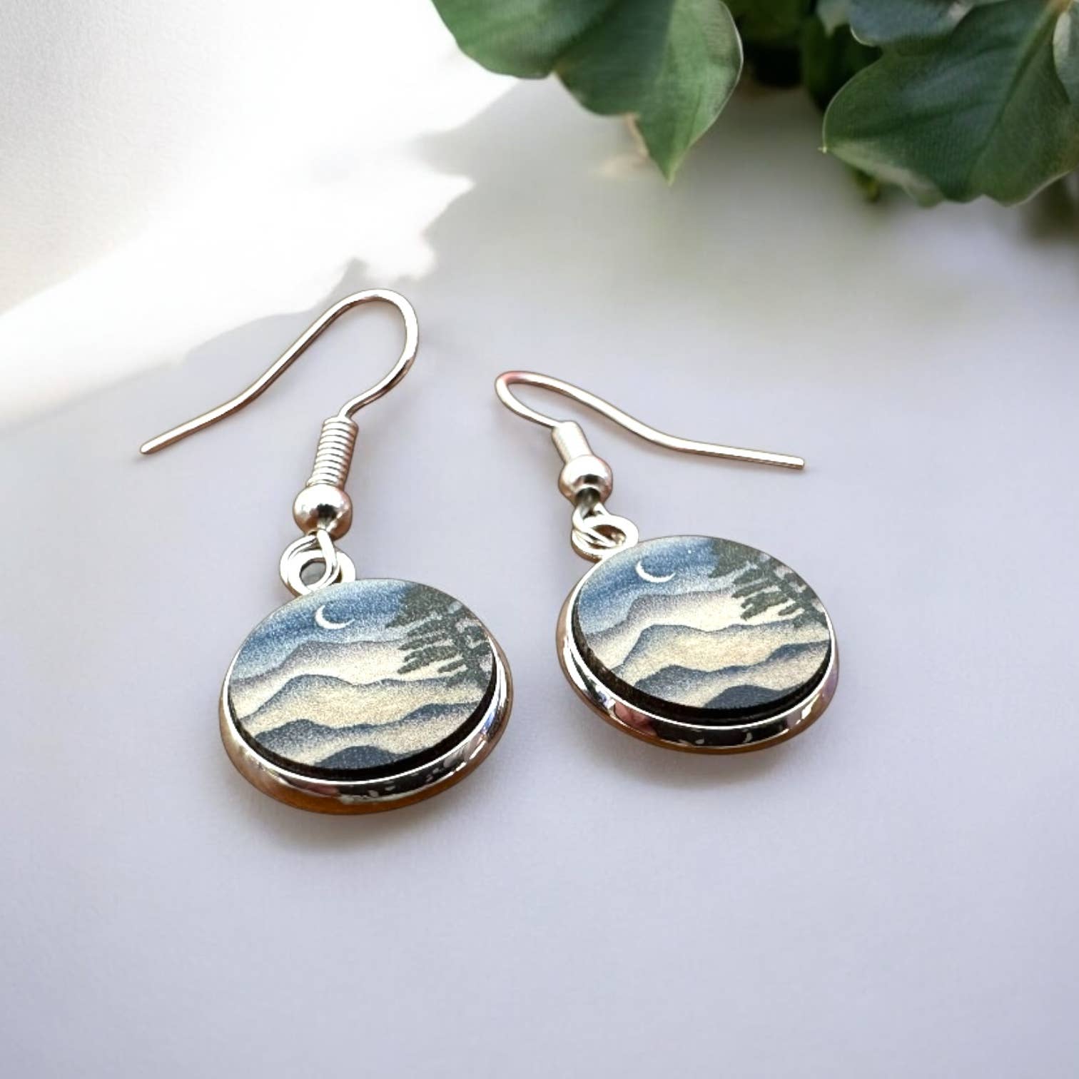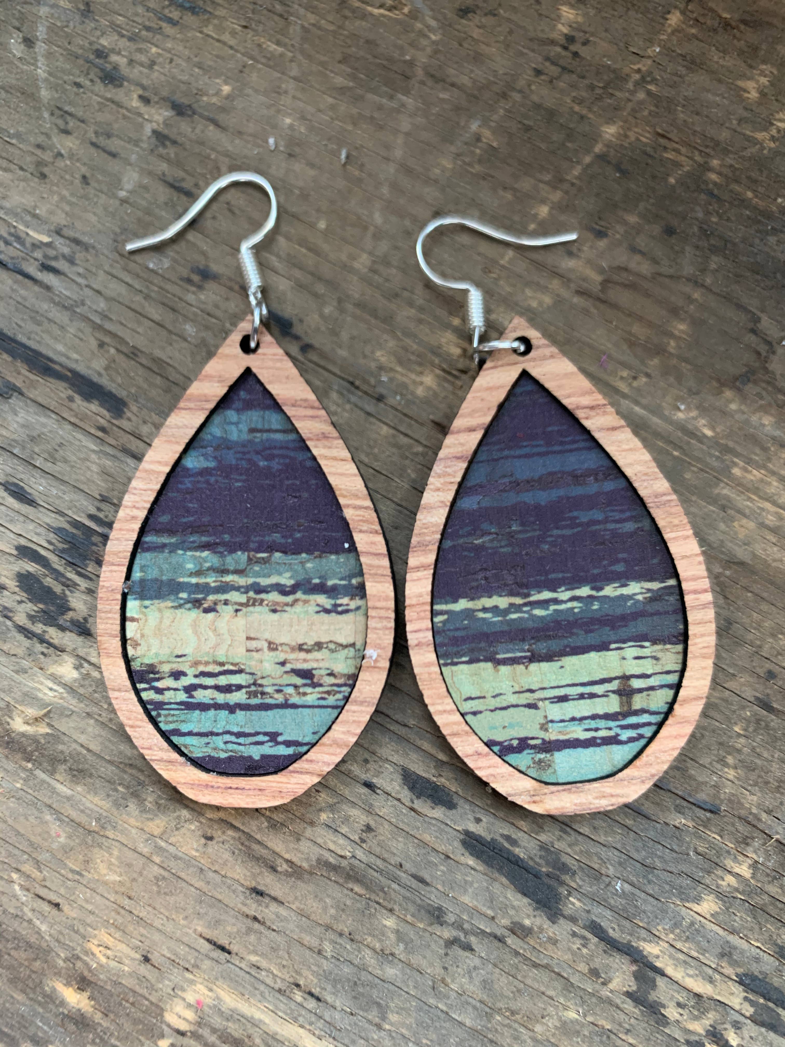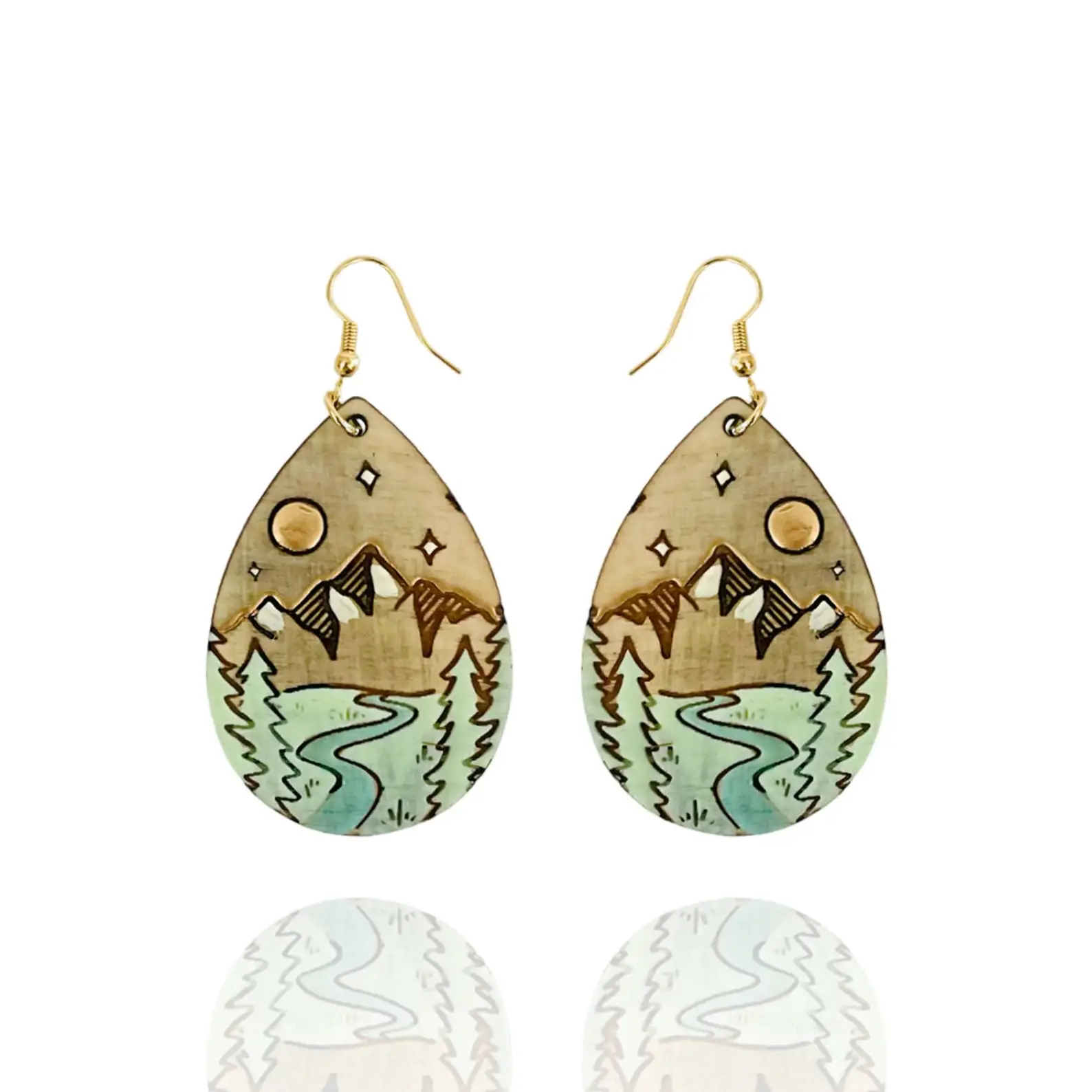 These earrings are a celebration of nature! Featuring a watercolor forest illustration, rendered in shades of gold, green, and blue. Made from sustainably sourced North American hardwood and finished with soy-based, BPA/VOC free resin, these vibrant earrings will bring joy and brightness to any wardrobe. Gold fill hoop ear wires. Approximately 1.5 inches long.
