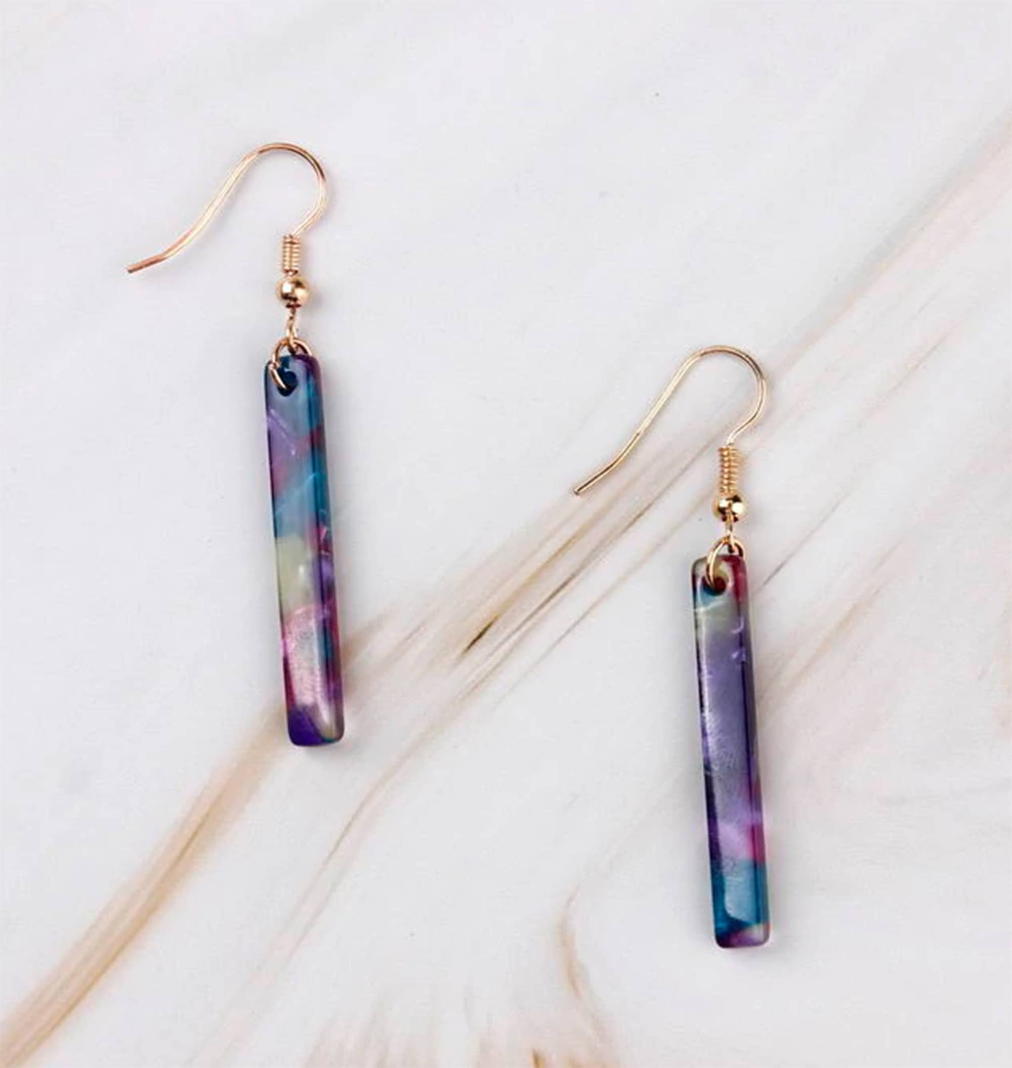 SKU: EAR7049 Made in United States Color: Blue, Green, Yellow, and Yellow Gold Is Set: Individual Material: Gold Filled, Paper, Resin, and Wood Occasion: Elevated Casual and Everyday Style: Artistic and Bohemian Theme: Nature Product Language: English Weight: 28.35 g (1 oz) Dimensions: 3.8 x 0.3 x 0.3 cm (1.5 x 0.1 x 0.1 in) Packaging: Recyclable Production: Ethically sourced