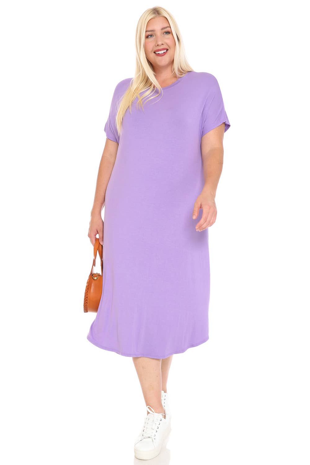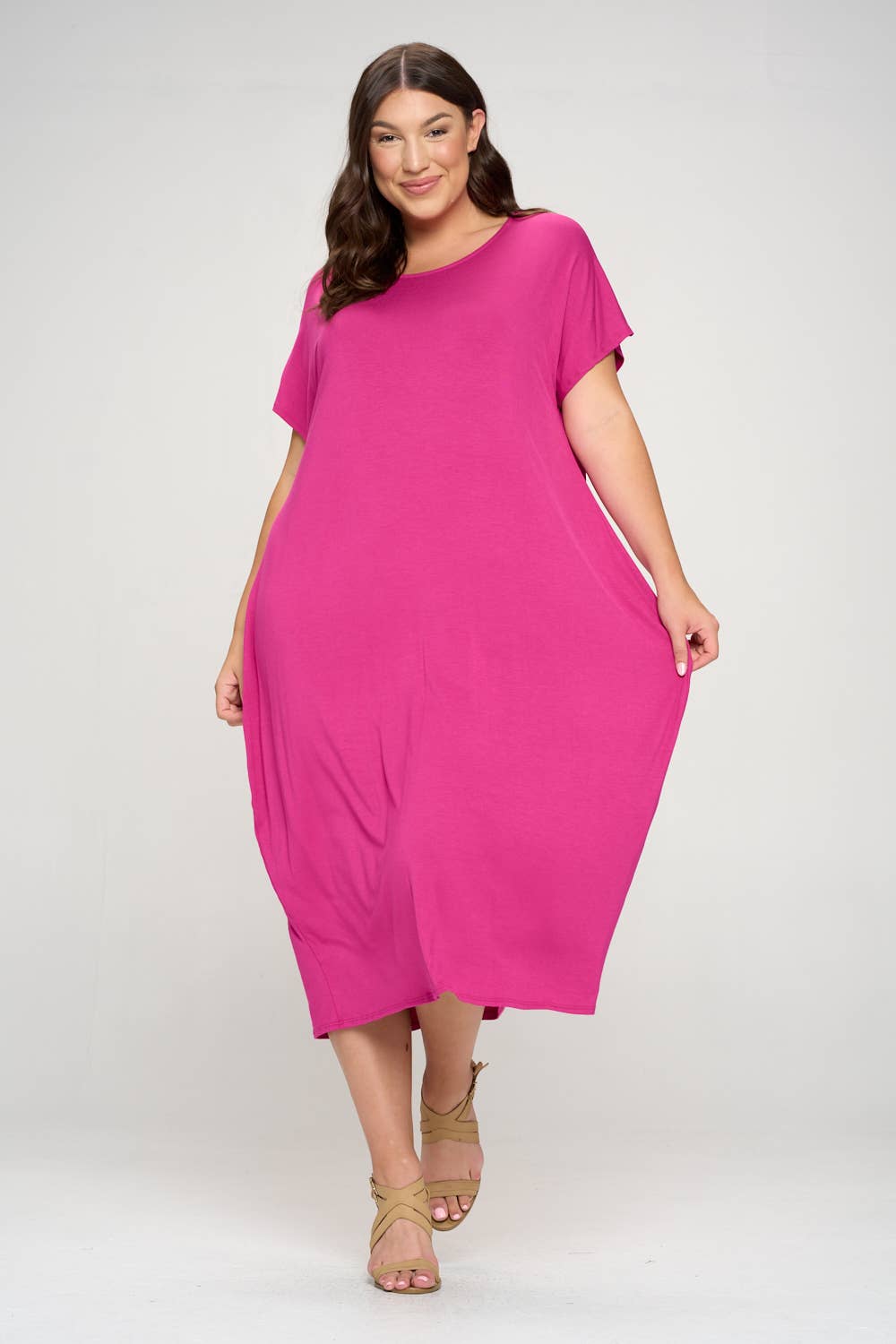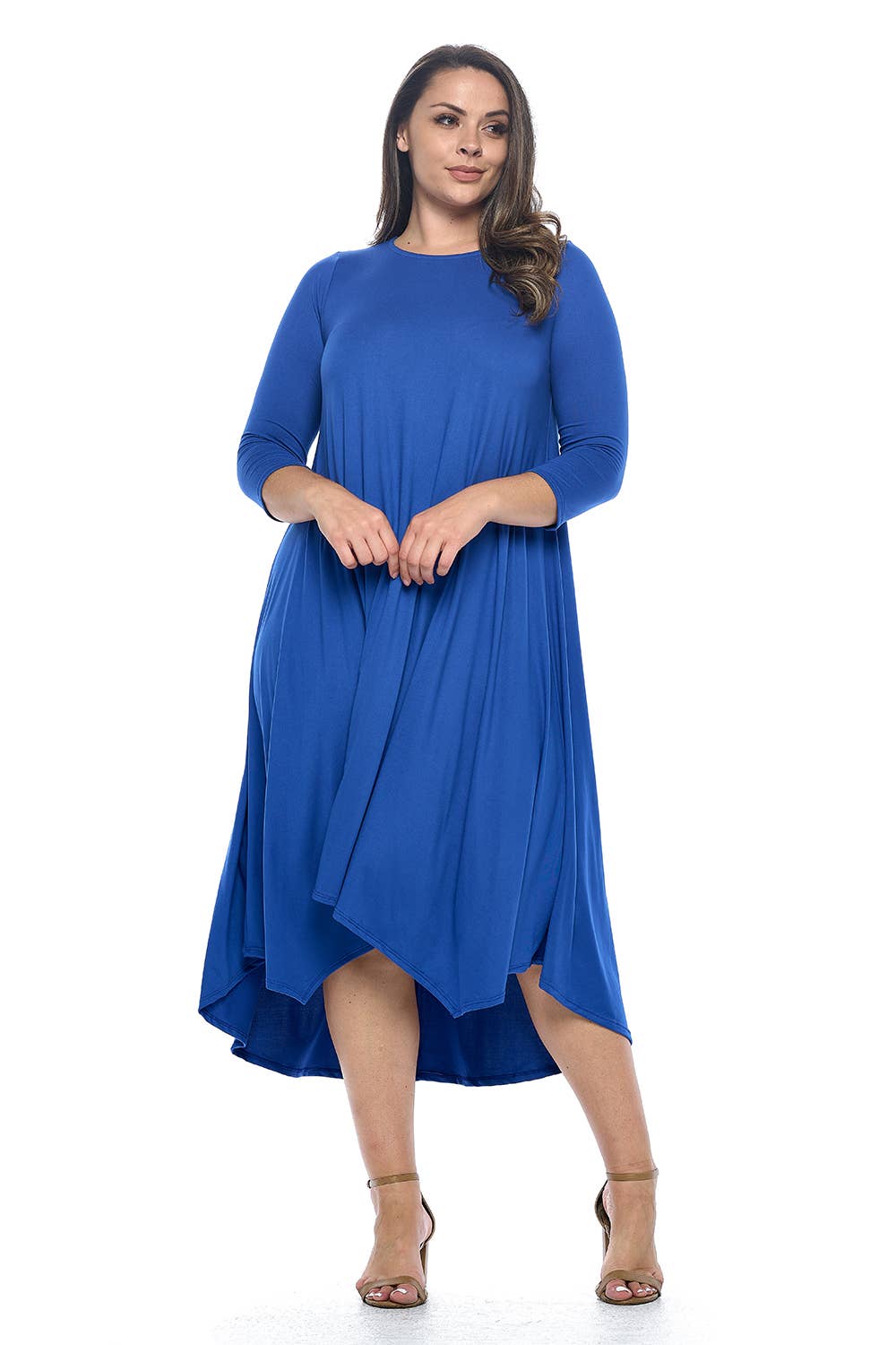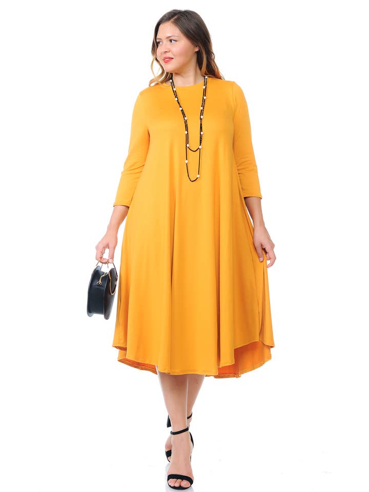 A-Line Swing Trapeze Midi Dress Plus A versatile wardrobe staple that can be dressed up with accessories and heels for a more formal occasion or dressed down with flats for a casual outing. Its stylish design and flattering silhouette make it an ideal choice for various events. - Crew Neckline - 3/4 Sleeves - A-Line Trapeze Silhouette - Midi Length - Relaxed fit - Model is 5’9” and wearing size 1XL.
