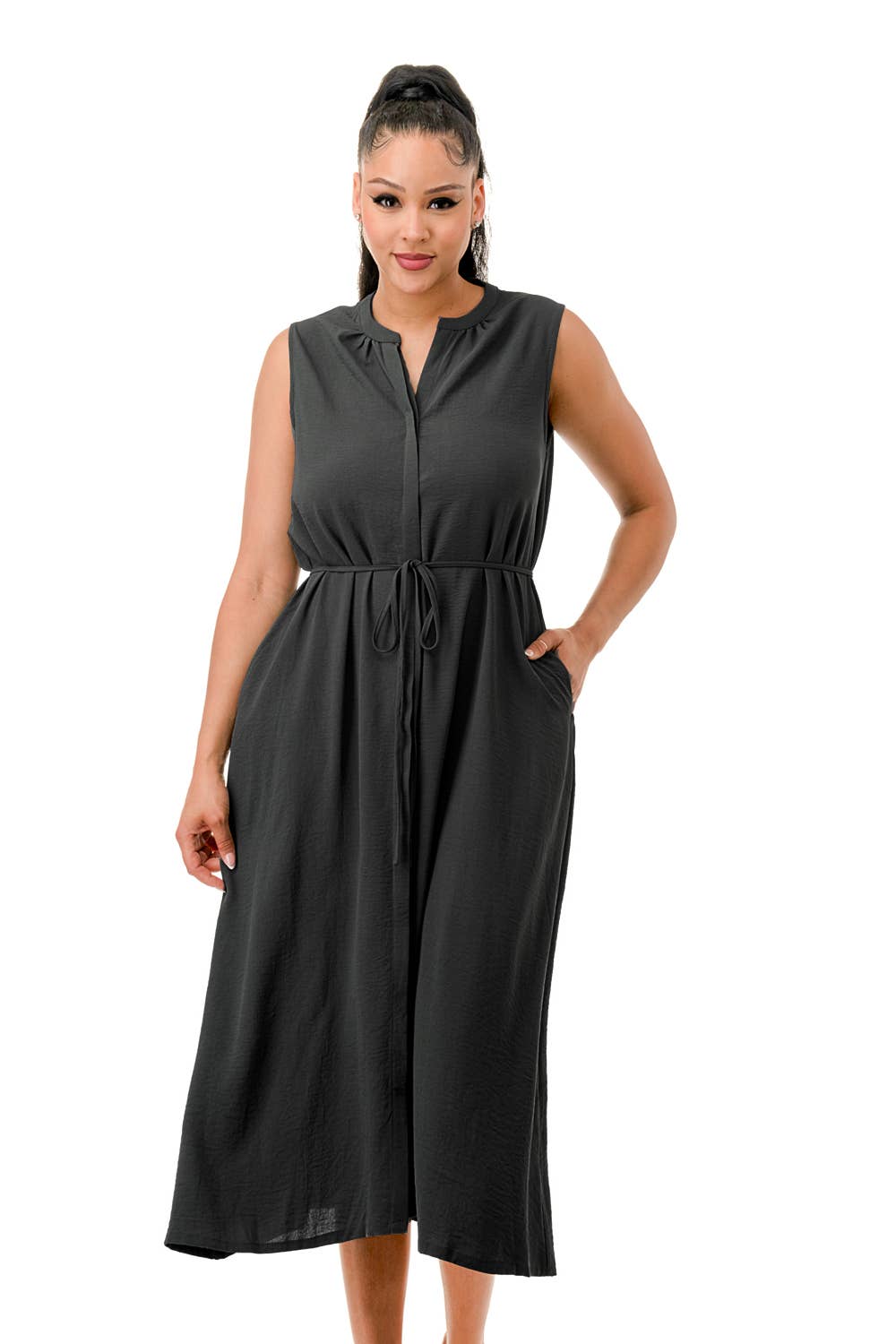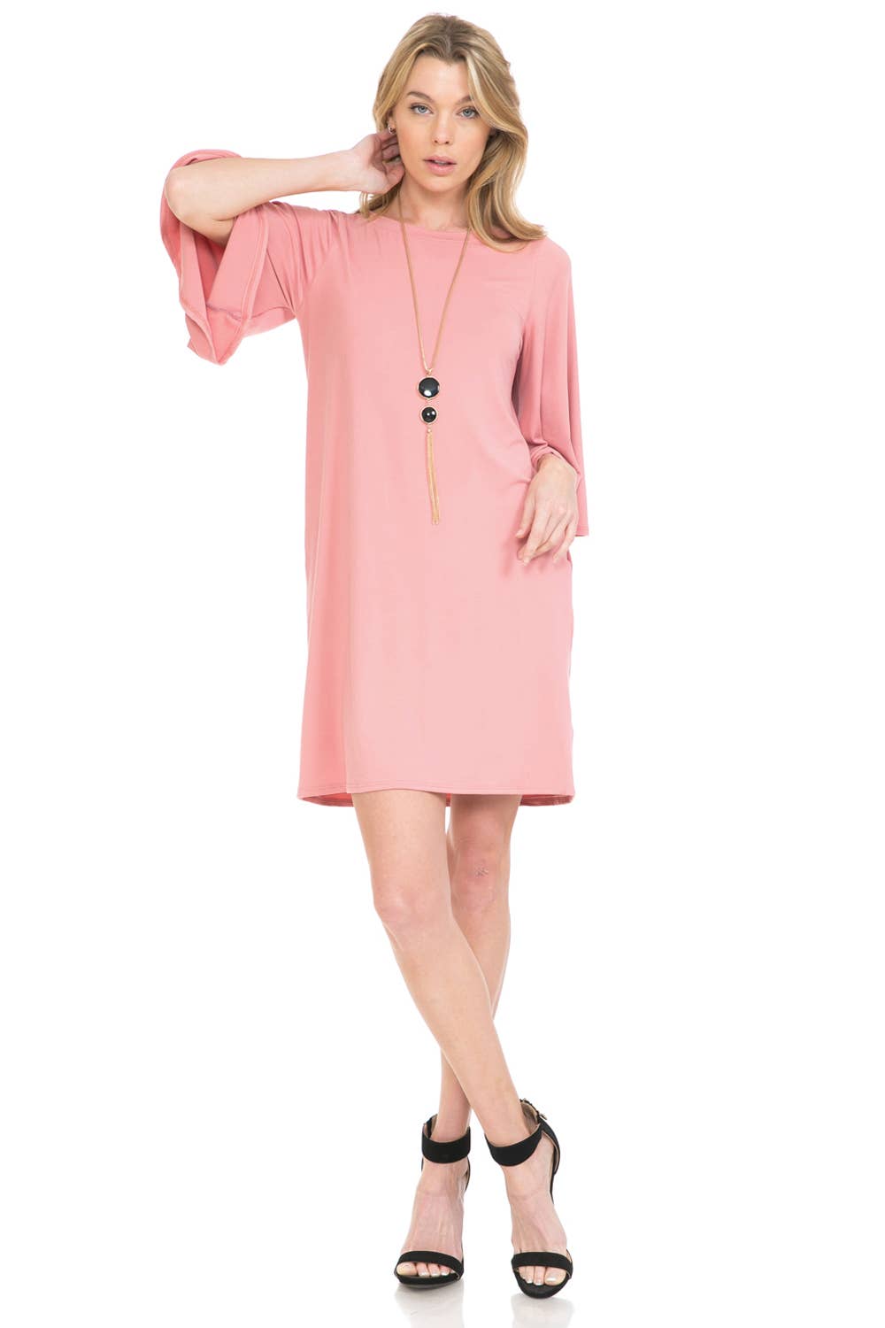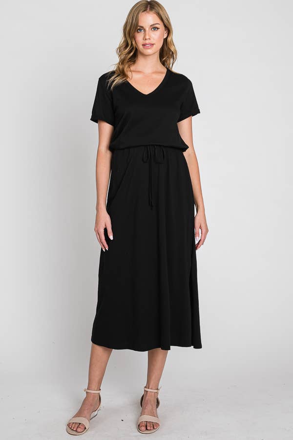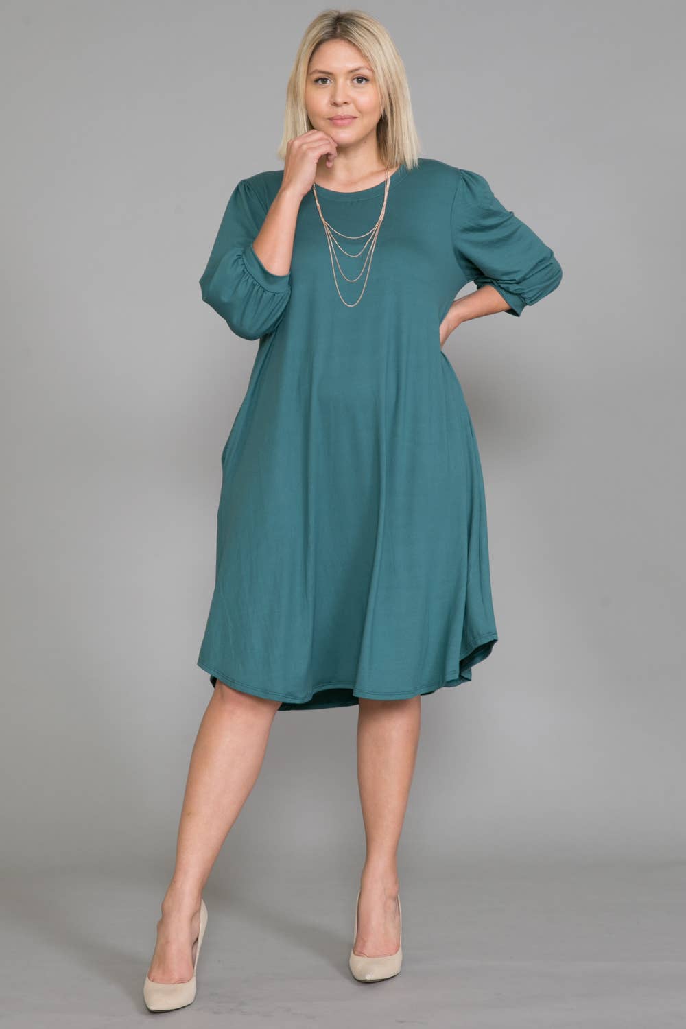 A-Line Swing Trapeze Midi Dress Plus A versatile wardrobe staple that can be dressed up with accessories and heels for a more formal occasion or dressed down with flats for a casual outing. Its stylish design and flattering silhouette make it an ideal choice for various events. - Crew Neckline - 3/4 Sleeves - A-Line Trapeze Silhouette - Midi Length - Relaxed fit - Model is 5’9” and wearing size 1XL.