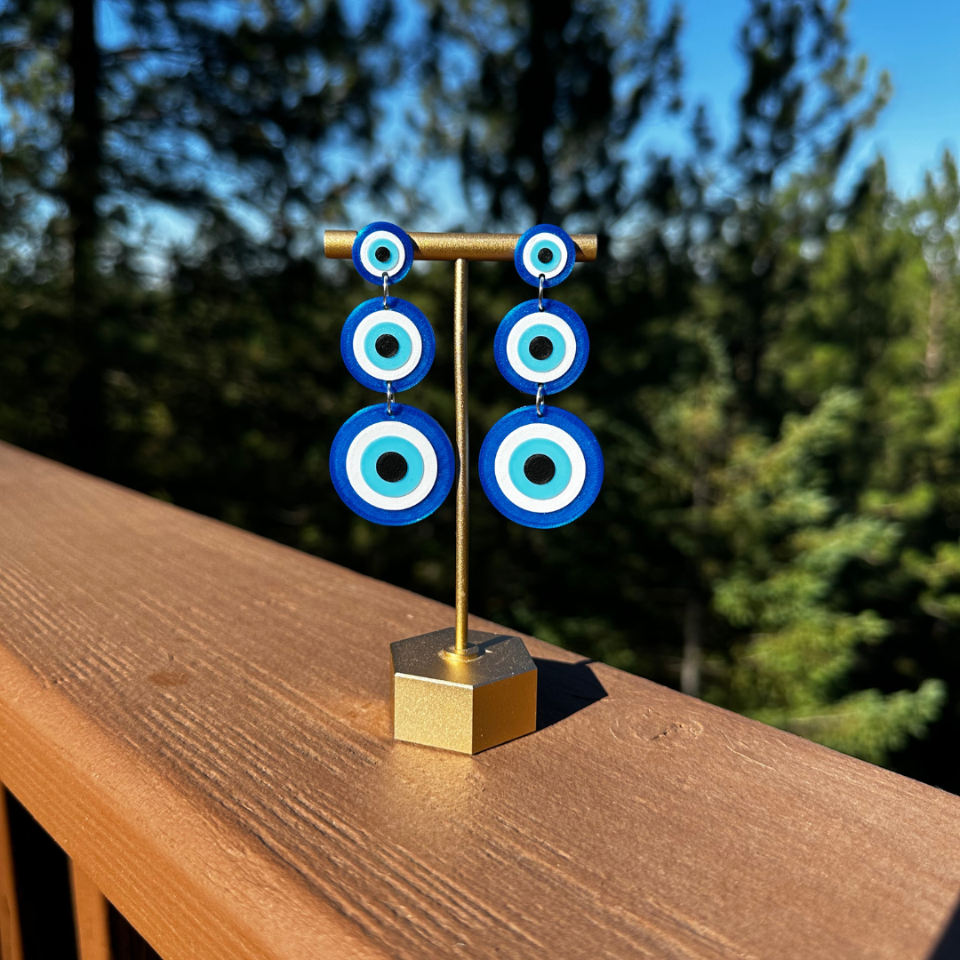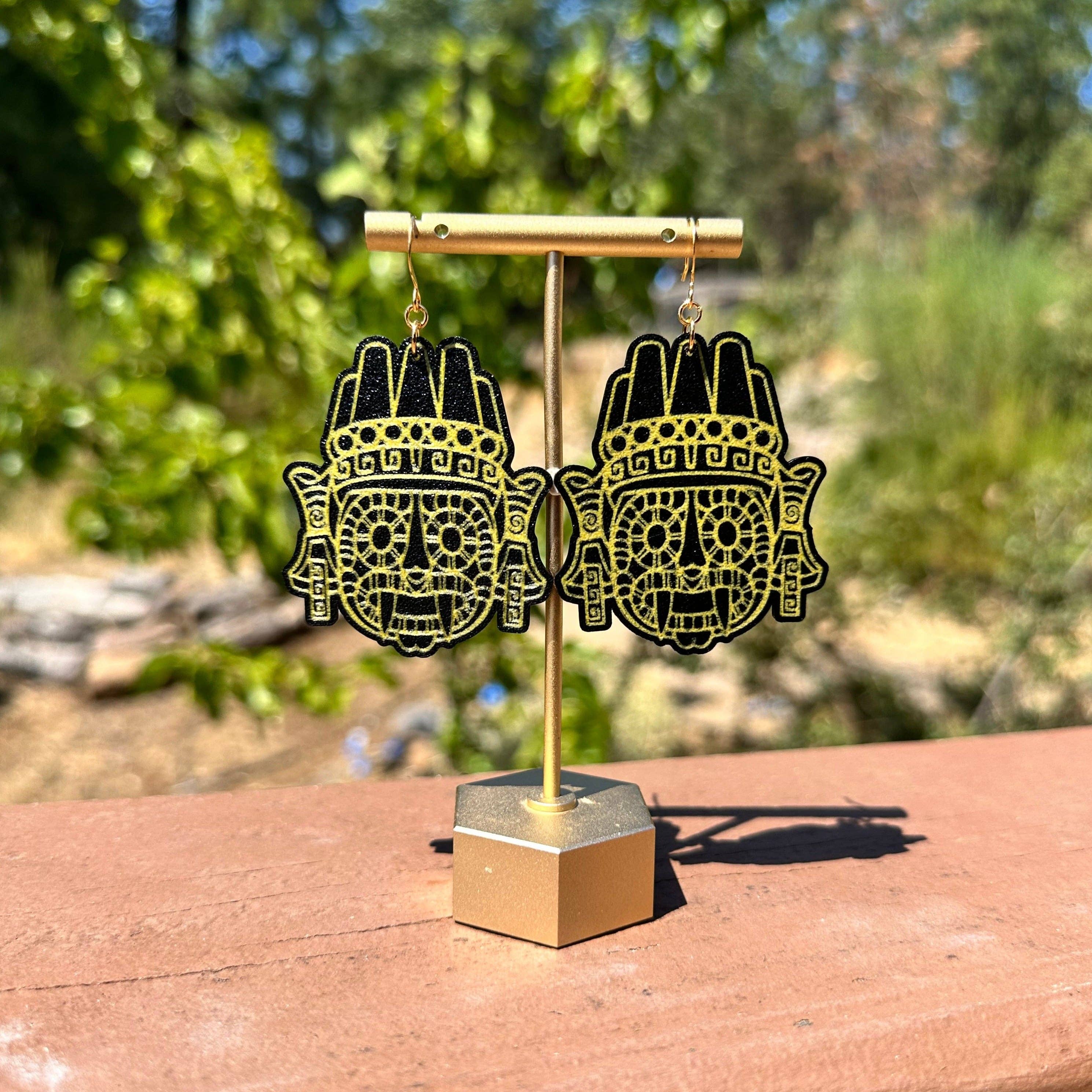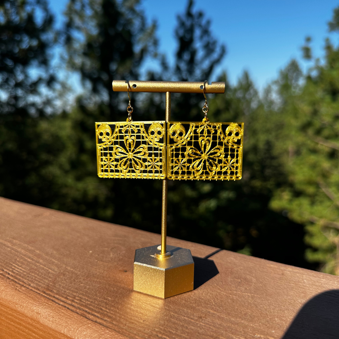 The gold on these earrings is printed with a dual colored filament that is gold with specks of silver. A lightweight statement earrings. MATERIAL: These earrings are 3D printed and gold plated earring hooks and earnuts. They are 2.5 inches in length.