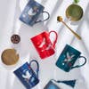 A very distinctive mug characterized by a eye-catching high gloss glaze finish – and a very unique handle. The mugs depict a very elegant crane in full flight. Cranes are a revered and popular symbol in Asia – often serving as a symbol of long life and health. The long graceful necks are pointed upward – symbolizing hope and optimism.