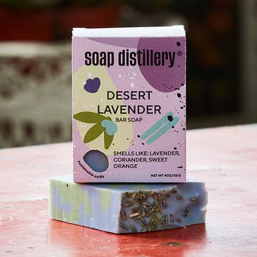 Inspired by its desert-loving counterpart, this classic blend of lavender buds, coriander seed, and sweet orange pays homage to aromatics in unlikely places. A truly unique lavender scent! This scent was formerly called “Lavender Bitters”. Scent Detail: Floral, light, and herbal. Top notes of lavender and orange, middle notes of desert sage and sand, bottom notes of coriander, ginger, and patchouli. Product Detail: Smooth and creamy lather nourishes skin and doesn't over dry. Formulated without the use of palm oil, animal fats, or sodium lauryl sulfate, our bar soaps are perfect for everyday use. Packaged in a compostable plastic-free box made from FSC Certified Paper derived from responsible sources. We say 'yes' to natural ingredients and 'no' synthetic dyes and non-ethically sourced micas. Retailer bonus: this beautiful carton keeps those shelves clean! Net WT: 4oz