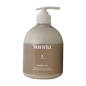 Gradual Tanning Lotion - 473 ML *NEW PACKAGING* Hydrate + glow, all-in-one. Our best-selling hydrating lotion just levelled up! Get a subtle, gradual glow while treating your skin to a dose of nourishing, organic and natural ingredients like hyaluronic acid, Jojoba and citrus essential oils. Indulge on the daily to achieve a subtly sunkissed, even all-over skin tone. Ideal for light and medium skin tones. Suggested Retail: $54 Directions: Before you apply, ensure your skin is clean and dry. Allow Hydrate Me lotion to fully absorb before getting dressed. Use circular motions and ensure even application all over your body. Be sure to wash your palms after application. For best results use a tanning mitt for application and exfoliate skin once per week. Use daily or as required to reach your desired glow. Leave on skin for a minimum of 8 hours before showering off with water. INGREDIENTS: Aqua**, Caprylic/Capric Triglyceride***, Dihydroxyacetone***, Heli