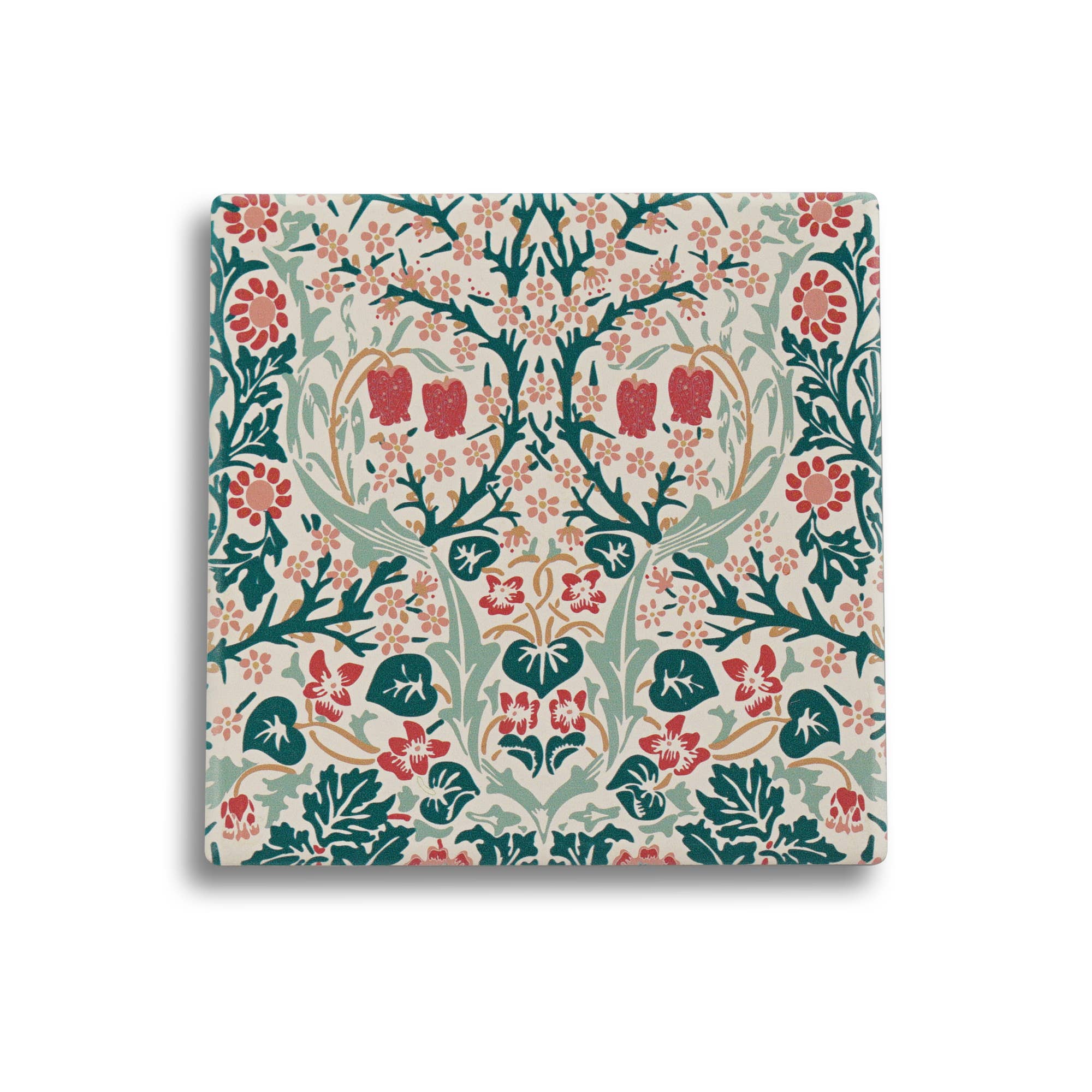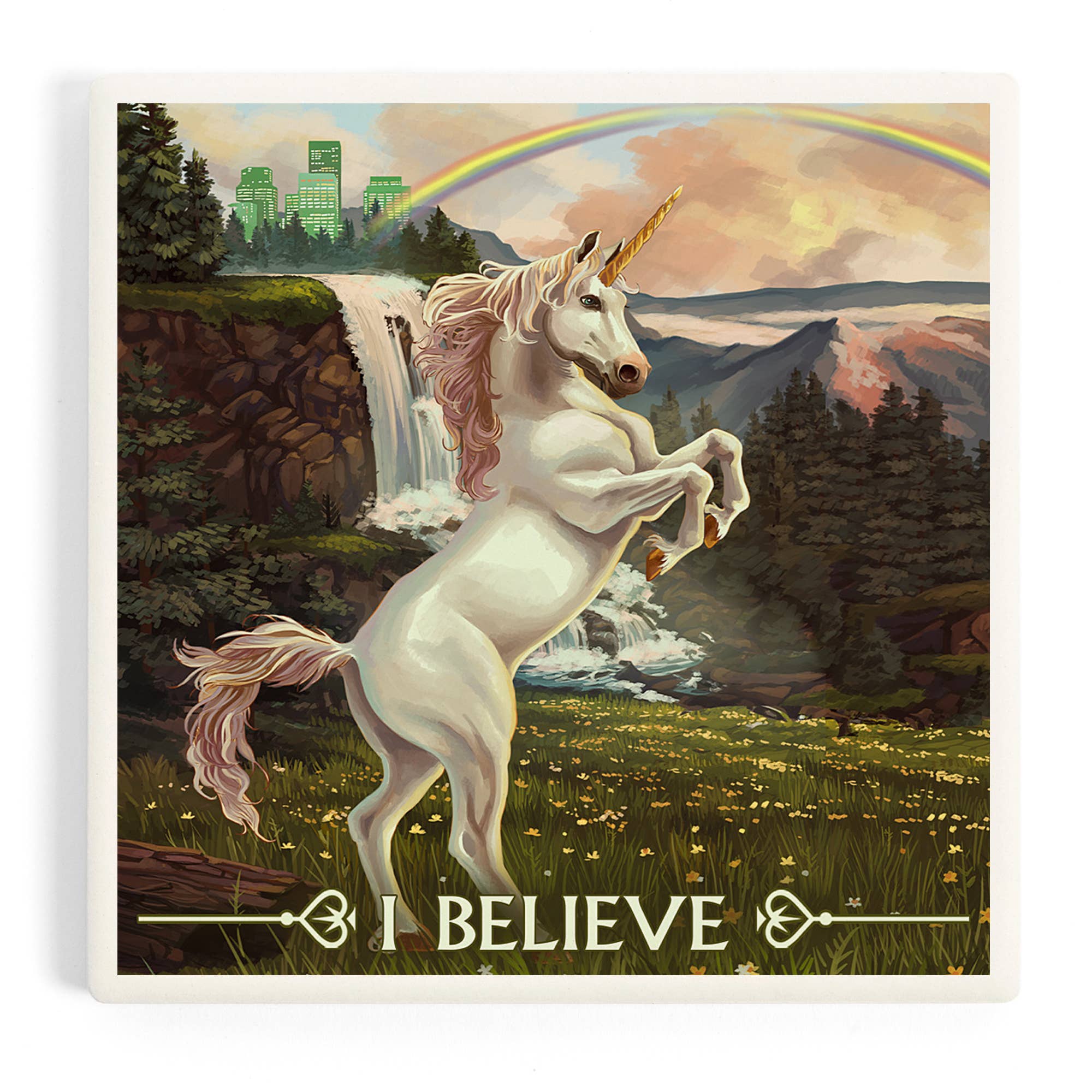 Painting of medieval unicorns coaster set. Handcrafted tumbled marble coasters by Studio Vertu. Each set/4 of coasters is handcrafted by our trained artisans in the USA. Because we use natural stone, variations are to be expected, and enhance the unique beauty of each tile! To clean, use a damp cloth and wipe clean. Do not use any harsh chemicals or abrasives. Dimensions: 4x4 tumbled Botticino marble. Corked backed 3 lbs
