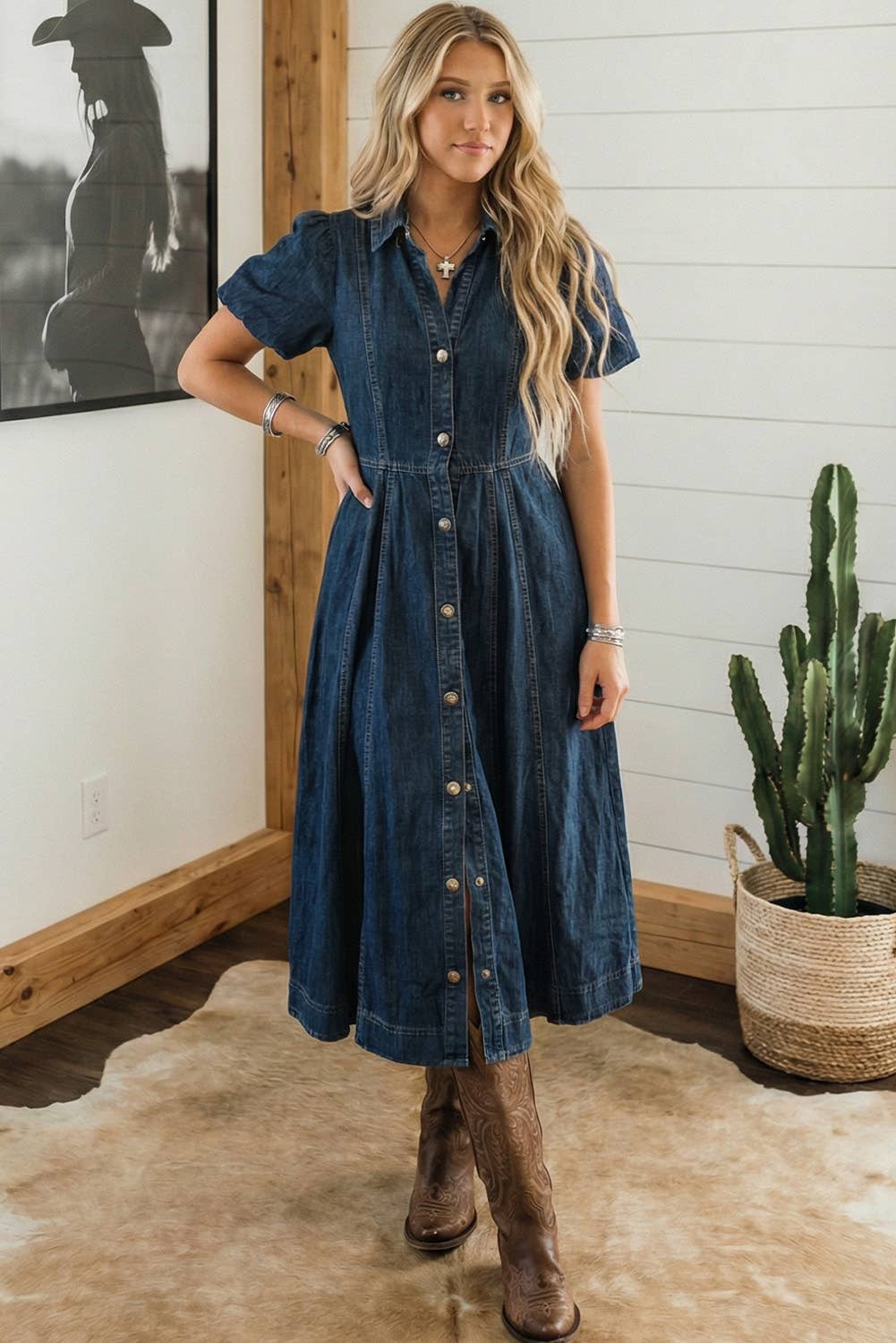 We wanted to turn classic Western denim into an effortless denim dress that could fit right in at the rodeos or a dimly lit dinner out on the town and anywhere between. Pearl snaps all the way, but secured at the waist and hip, bracelet length sleeve, classic western shirt details and a soft denim wash. This dress is made to flatter any figure and style any way.