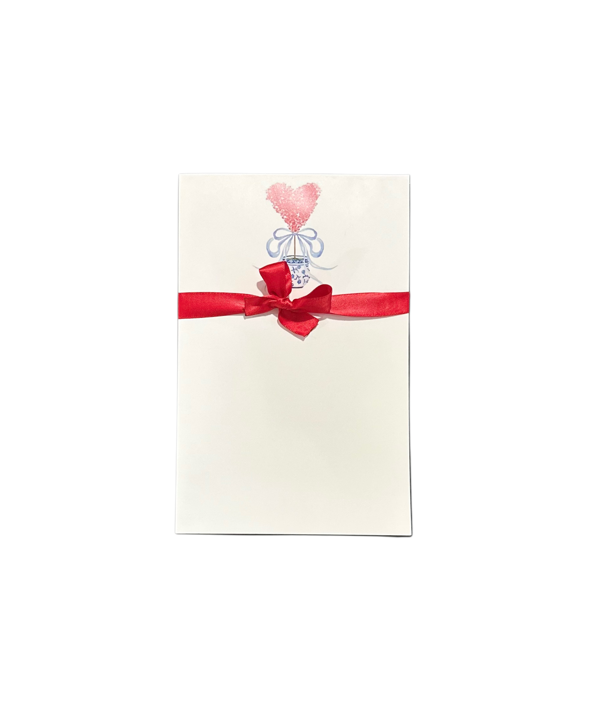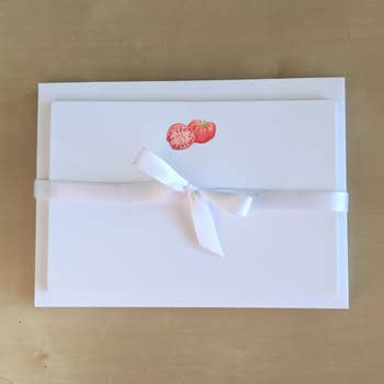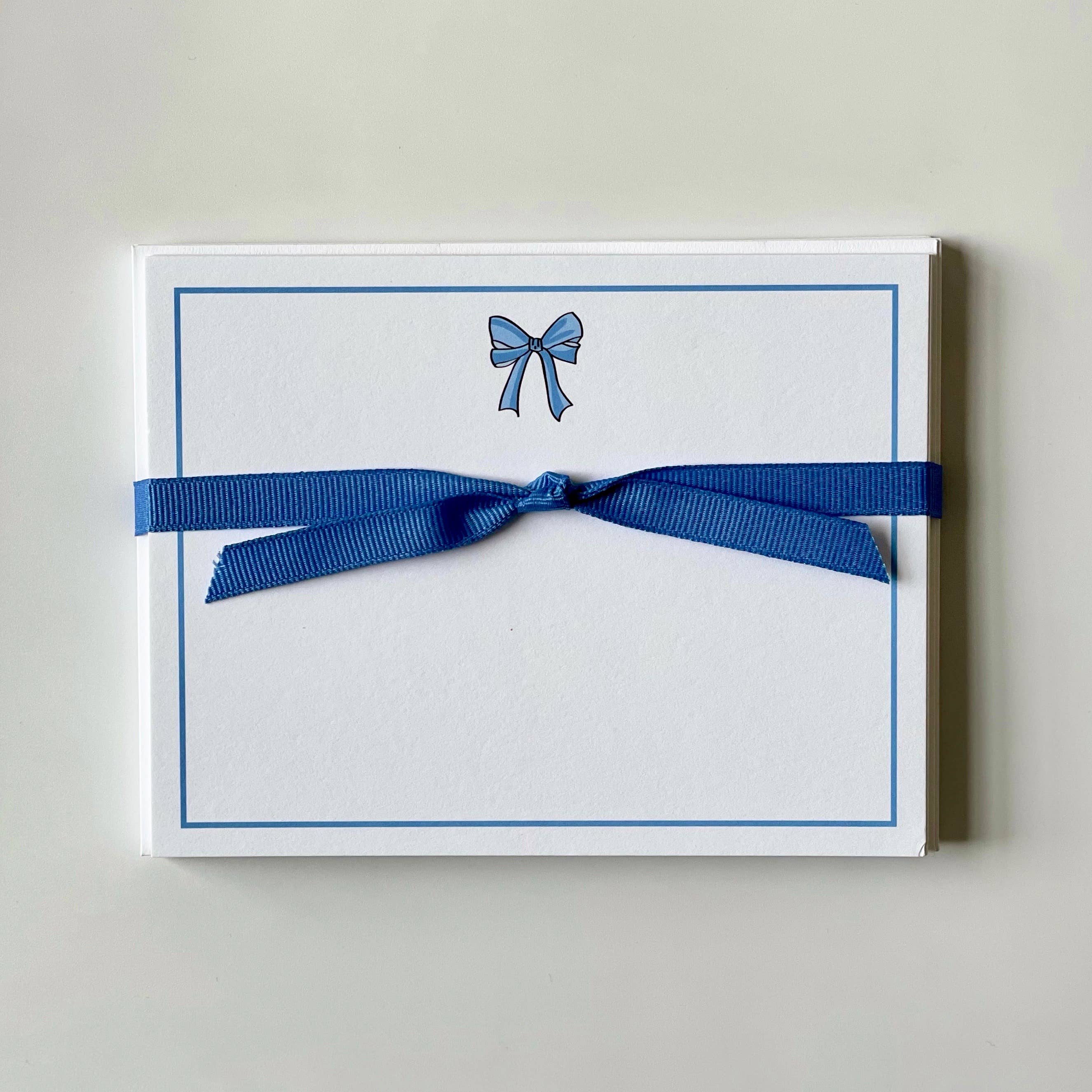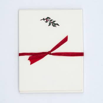 Set of 10 flat note cards and envelopes. 5.5 x 4.25". Tied with coordinating ribbon and packaged in clear bag. Ultra white paper stock
