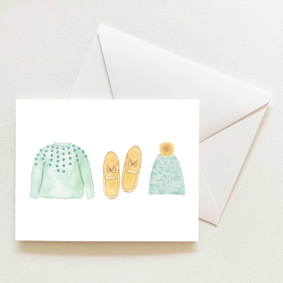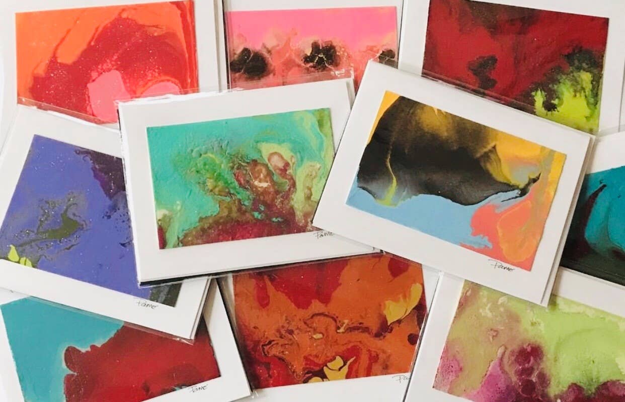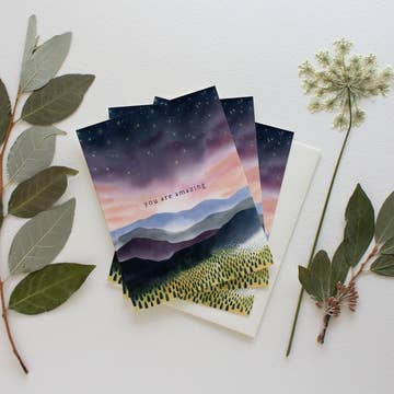 Inside Greeting: (blank inside) Box of 8 cards and envelopes. 4 1/2x6 white matte blank cards, printed on thick card stock and paired with celestial blue envelopes. Matching design also available as kitchen towels! Designed by artist Amy Wike. Sustainably made in the USA!