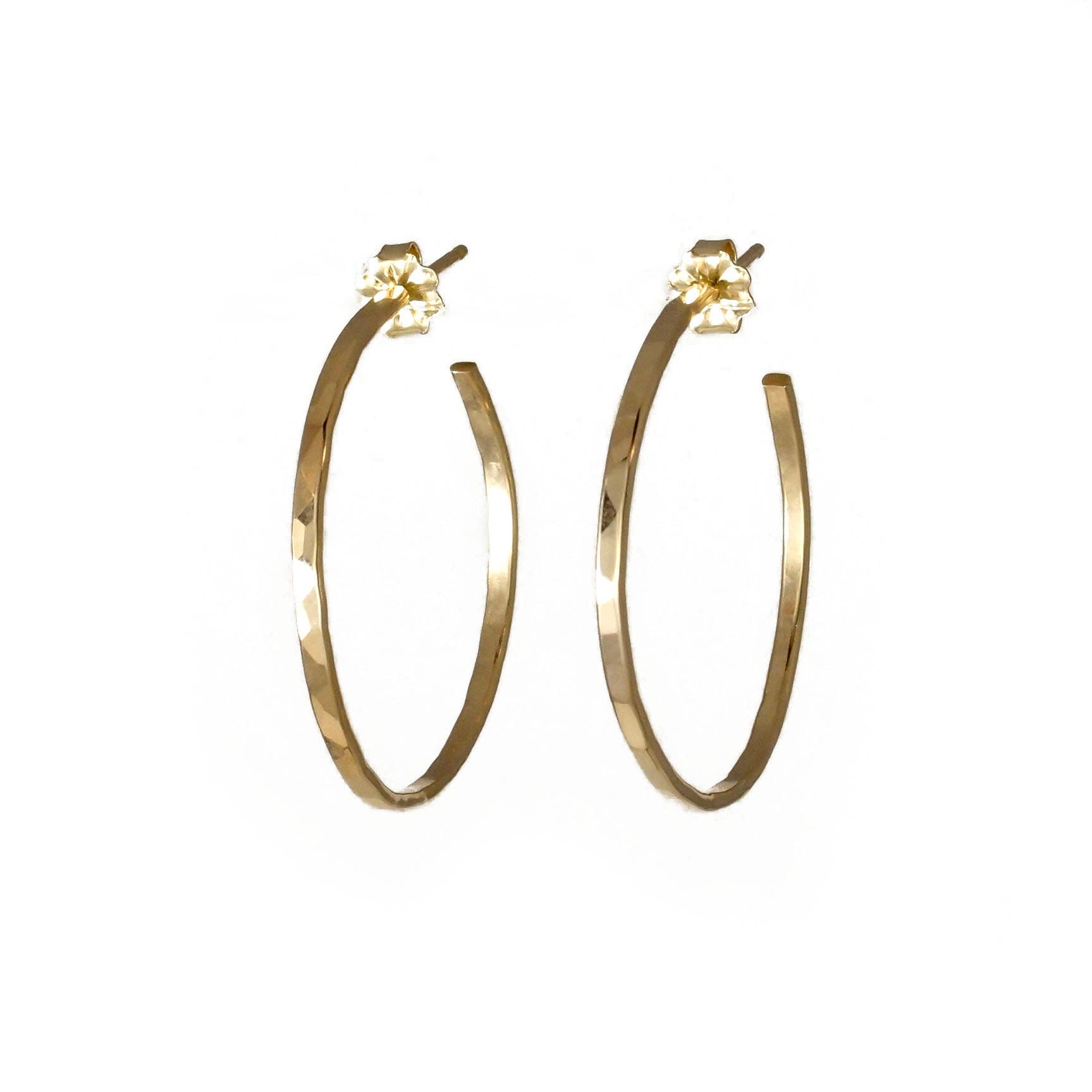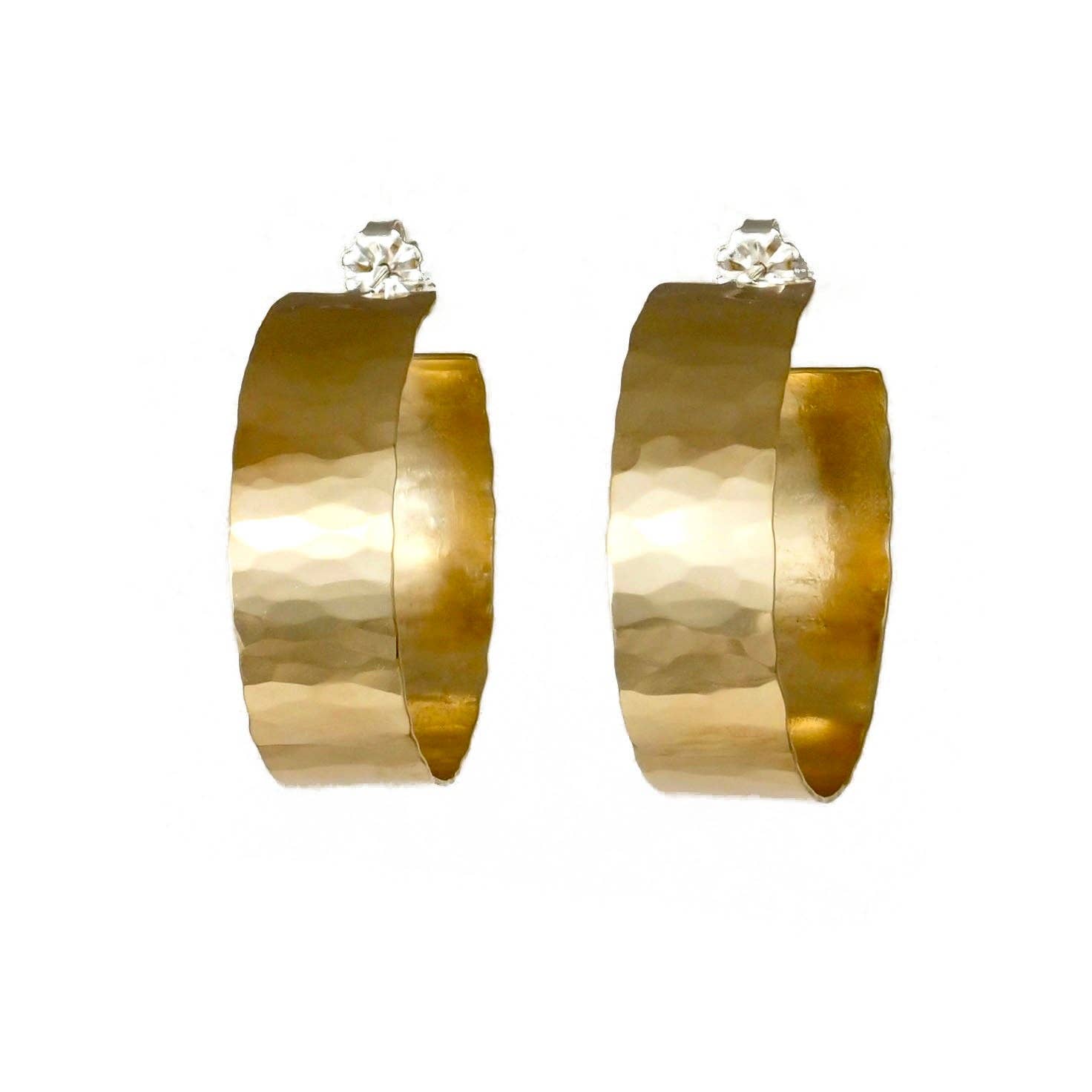 The Misha Hoops are small ribbon hoops finished with my signature hammered finish. These classic hoops are made with a hand forged sheet and are lightweight and easy to wear. Available in 14K gold fill, sterling silver or brass. - Gold fill comes with gold fill posts and backs, brass and silver come with silver posts and backs - Hoops measure 3/16" wide x 7/8" in diameter
