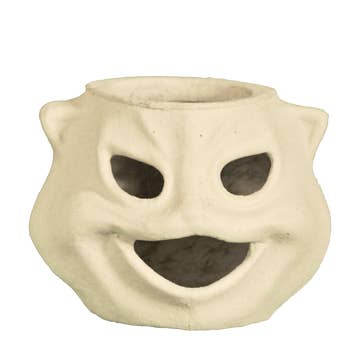 "Cat Face Pumpkin" has a hollow interior with an opening on top, ready to be made into a trick-or-treat basket or lantern. His eye sockets and open mouth are hand finished and ready for your choice of paper face insert (sold separately). This is a reproduction of a 1940s Halloween decoration and is produced on the same type of machinery as the original antiques. The Cat Face Pumpkin is manufactured in the U.S.A. and is made from 100% recycled, food grade paper, sourced from within the United States.