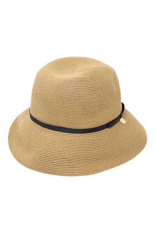Hat-Bronze top black mix brim, 4" patterned brim black tie in bow around crown, elastic tie in crown, 57 cm