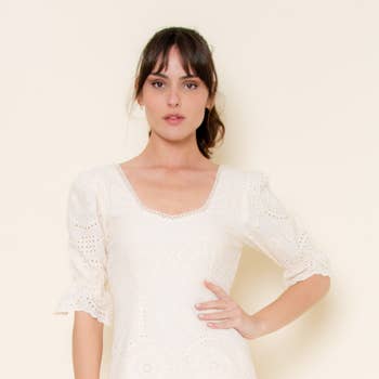 -Style No.:JD2443-5 Embroidered tiny daisies and eyelet baby doll dress. It displays a square neckline, 3/4 puffy sleeves, and two bust darts. It also has an empire gathered waist and a back zipper for off/on access. Storia