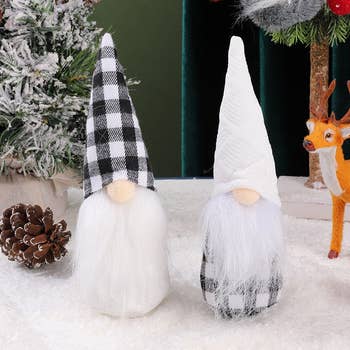 16" Black and White Buffalo Check Gnome is agnome sitter with a wired black and white buffalo check cap. Gnomehas a white faux-fur beard and a bulbous peach-colored nose and it is perfect for every day display. Measures 16.5" high.
