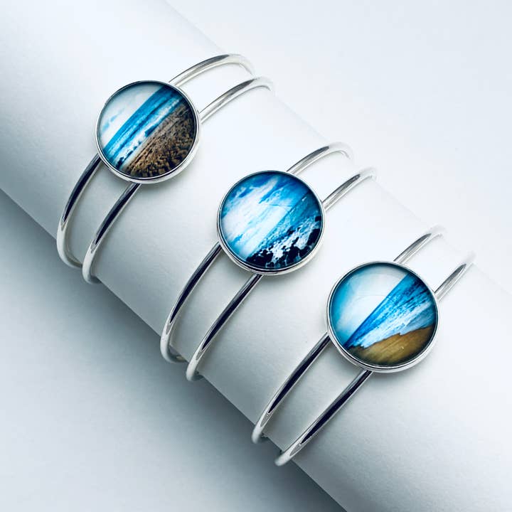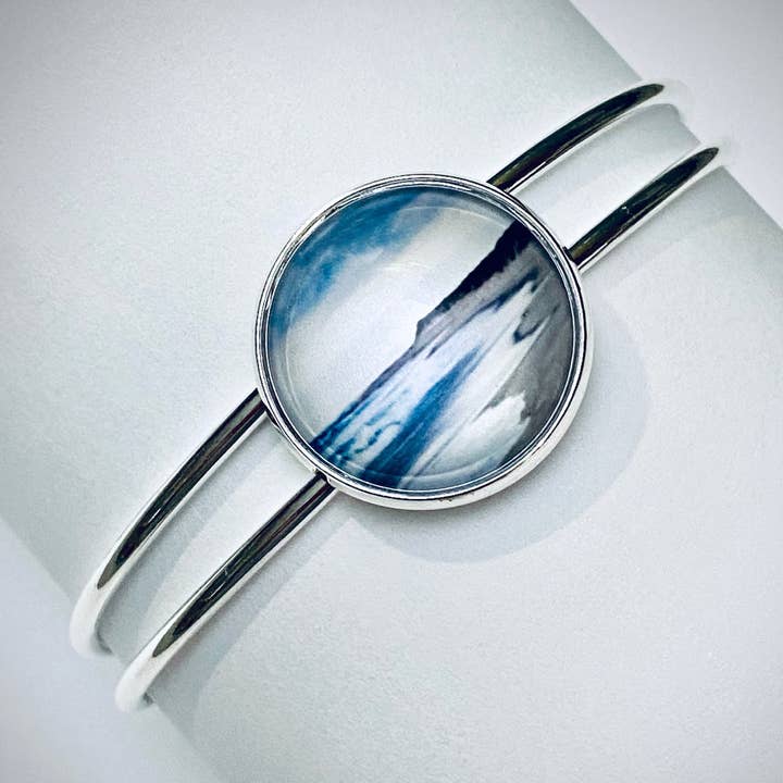 Bangle Bracelets in our Nature Collection are designed using original metallic photographs that are set by hand under a beautiful 20mm magnifying glass dome. Pair with the matching necklace and add either the post or drop earrings to complete the set. Or mix and match designs from the Nature Collection to create your own style. Bezels and bangles are silver plated brass. Nickel and lead free.