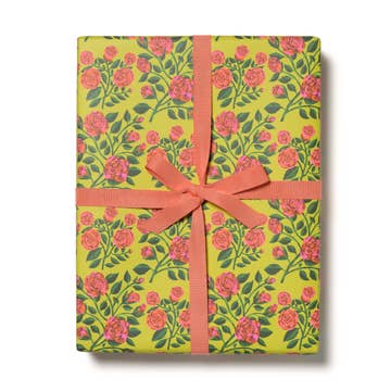 Holiday wrapping paper with a flower pattern of green vines and crimson blooms. • Gift Wrapping Sheets • Available as single sheets or rolled sets of 3 sheets • Single sheets will be collectively rolled and wrapped in paper for protection in transit. Rolled sets of 3 will be shrink wrapped. Ordering by sheet allows us to ship your wrap plastic-free and with minimal packaging. As a result, we're able to offer a lower price when selecting this option. • 19.5 x 27" • 70# uncoated matte paper • Printed in the USA