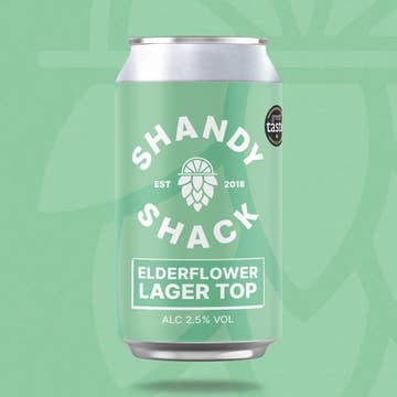 A case of 12 x 330ml Shandy Shack Elderflower Lager Top cans. A light, crisp pilsner topped with a splash of fruity elderflower cordial. Tastes like summers on the village green. 105 calories per 330ml.