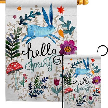 A double-sided polyester garden flag from our Cottagecore Collection displaying a hand painted design of mushrooms, wildflowers, butterflies, and snails in a delicate watercolor style surrounding a comforting sentiment that reads "Home Sweet Home." Flag is weather-resistant and features an opening to hang on our Garden Flag Pole. Hand-wash only. Our Home Sweet Home garden flag is packaged with a header card and hook to easily hang on rack. A rustic everyday home accent perfect for any yard or garden.