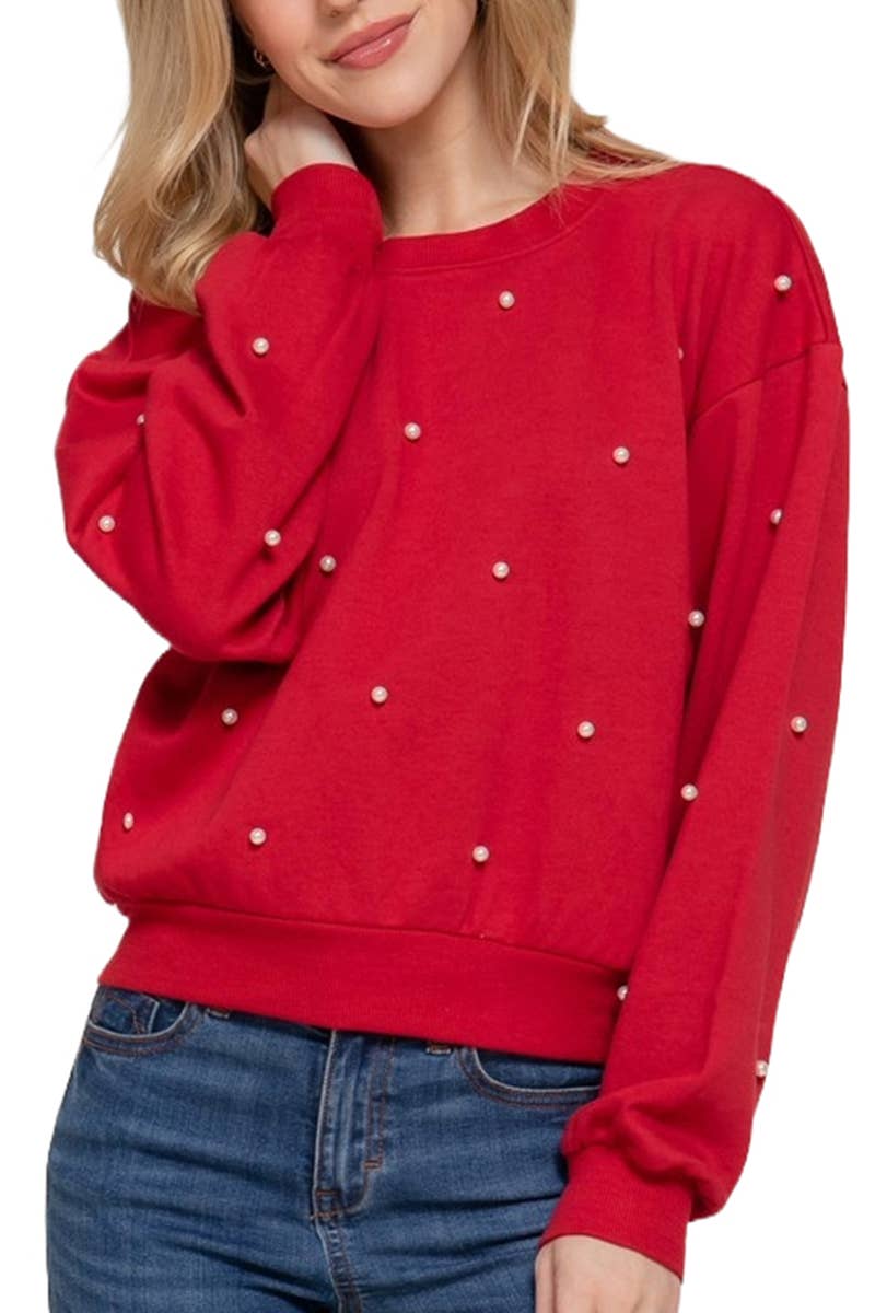 A SOLID PULLOVER TOP FEATURING A SEQUIN CONTRAST, ROUND NECK, BISHOP LONG SLEEVES, AND A RELAXED FIT.