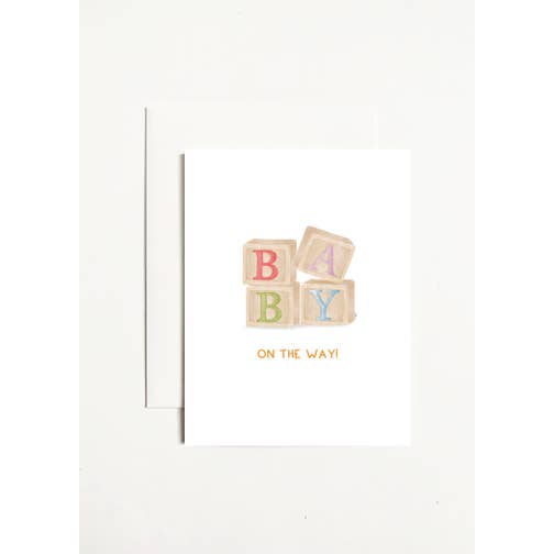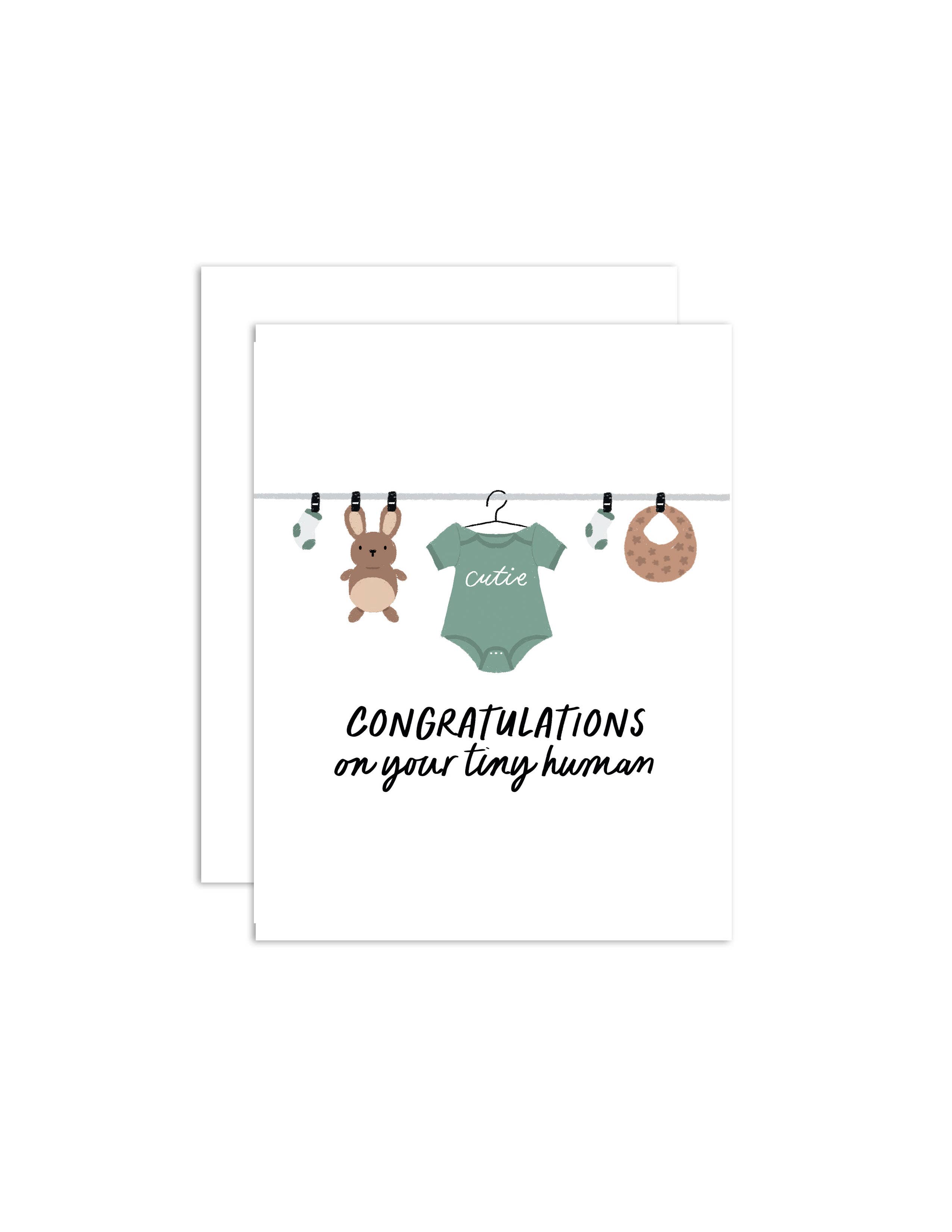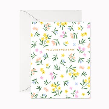 • 4.25x5.5" (A2) folded greeting card • Printed on 110 lb smooth stock • Includes a white A2 square flap envelope • Blank inside • Packaged individually in a clear sleeve Front of card wording: "welcome, little one"