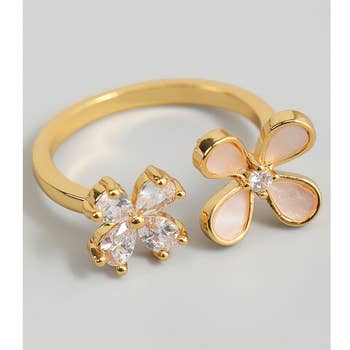 Guaranteed to add a touch of glamour to any outfit, this ring offers a remarkable gold dipped cubic zirconia flower bow ribbon design. A versatile ring that's perfect for any occasion, adding a touch of elegance and style to any outfit. Available in G. This item is sold in packs of 1. Ring Size 6.5 This ring is made with 70% Brass and 30% Cubic Zirconia. Made in Korea.