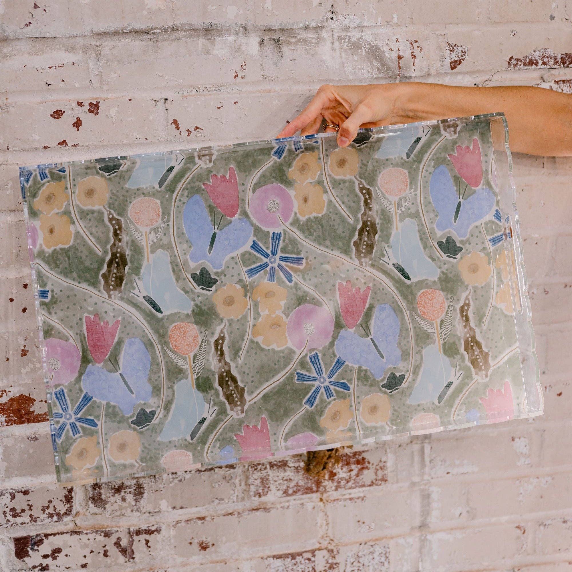 Add some flair to your vanity or nightstand with this scalloped, acrylic tray using Teil's, "Tulip Arc, Olive Green" pattern. Size: 9” L x 6" W x 2" H Material: Acrylic