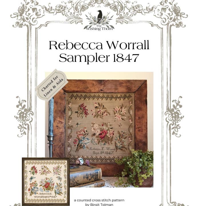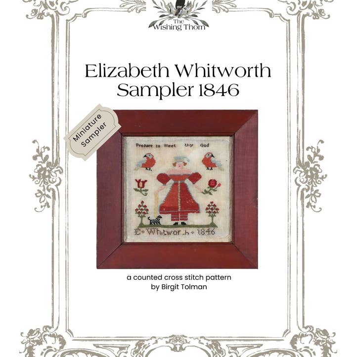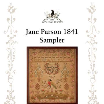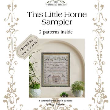 A reproduction of an American schoolgirl sampler worked in 1848 at Mrs. Cooke’s School in New Hampshire. This charming piece reflects the elegance and discipline of mid-19th century needlework education. The original sampler, signed simply “LSC”, features a beautifully detailed bird surrounded by lush florals, paired houses, and delicate wreath cartouche, all arranged within a classic border. The model is stitched on 36 count “Hazelnut” by Fiber on a Whim and worked using Belle Soie over-dyed silks by Classic Colorworks, giving the design a soft, antique glow and a wonderfully smooth stitching experience. The chart consists of color, black & white and single page graphs (15 pages) Thank you and happy stitching! ©The Wishing Thorn. All Rights Reserved