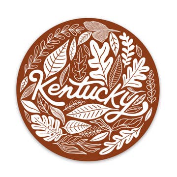 Inspired by Kentucky foliage, this design encompasses simple line drawings of leaves and other elements. It's the perfect addition to your favorite notebook, laptop or water bottle. - Hand-drawn design - Durable vinyl to protect from scratches, water and sunlight exposure - Sized at approximately 3inches - Circle Shape - Smooth finish - Warm Orange Color Great as: Gift Ideas, School Supplies, Stocking Stuffers, Snail Mail Items. Perfect for: Bookstores, Local GiftShops, Tourism, Paper Goods and Stationery Stores.