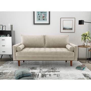 Experience comfort and durability with our 3-seater couch, featuring corduroy twill upholstery in a sophisticated light brown. Built with a solid walnut wood frame and legs, it offers exceptional support. Scratch resistant for everyday resilience, this couch is perfect for added style and coziness. Product Dimensions: Overall: 80.5"W x 33.5"D x 34.5"H Weight: 88.2 LBS Seat: 68"W x 21.5"D x 18"H. Back: 68"W x 7"D x 17"H. Arm Dimensions: 6"W x 33.5"D x 26.5"H. Leg Height: 6.5"H.