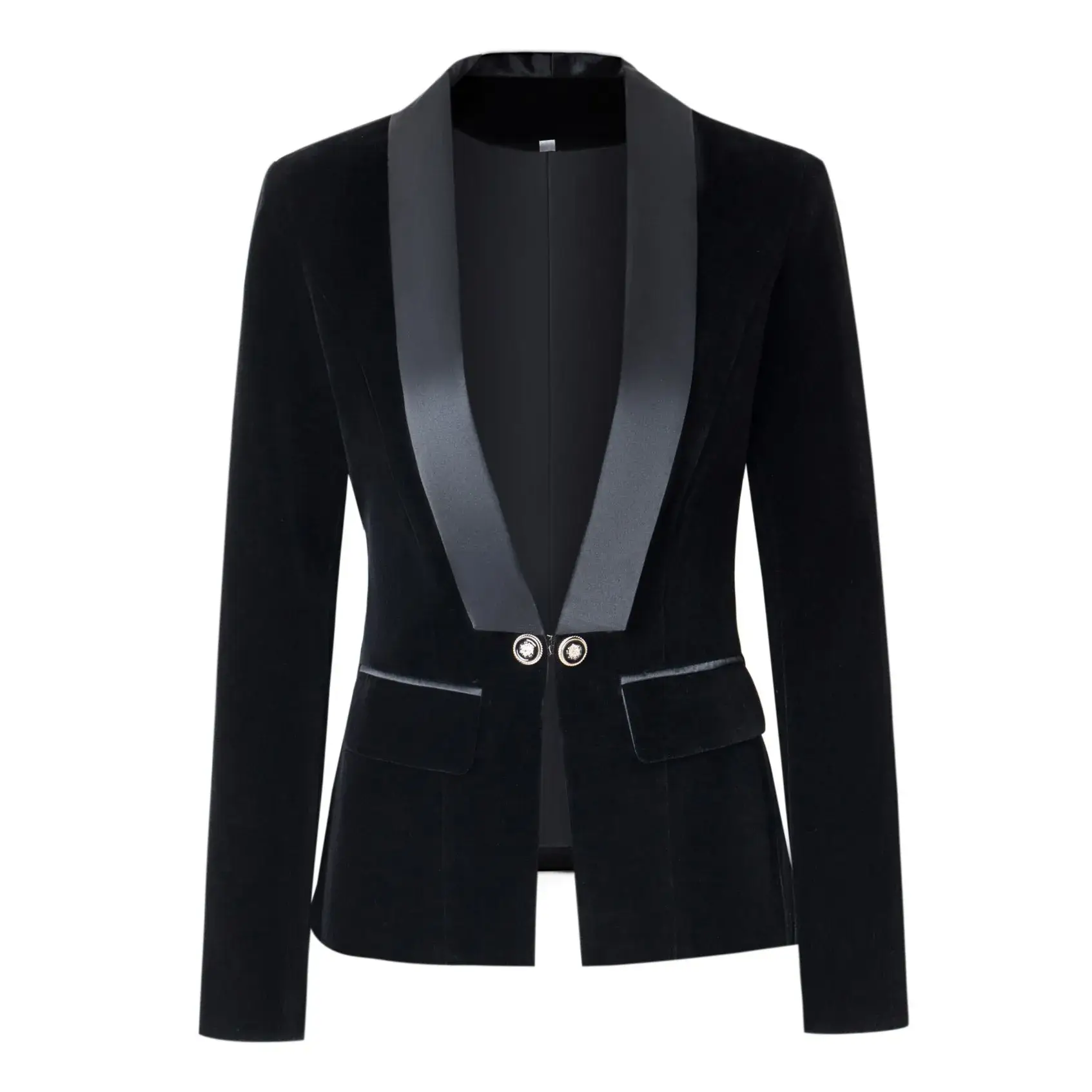 This suit features a soft and smooth velvet fabric, a flattering V-neckline, and a chic satin collar that adds a touch of elegance. The suit is slim-fitting and has a single-button closure, two front fake pockets, and long sleeves. It is perfect for business meetings, formal events, or any occasion where you want to look sharp and classy. You can pair it with a blouse, a skirt, or pants of your choice. This suit is available in various colors and sizes to suit your preferences and needs. Order yours today and enjoy the quality and comfort of this Women Velvet Blazer V-neck Suit with Satin Collar.