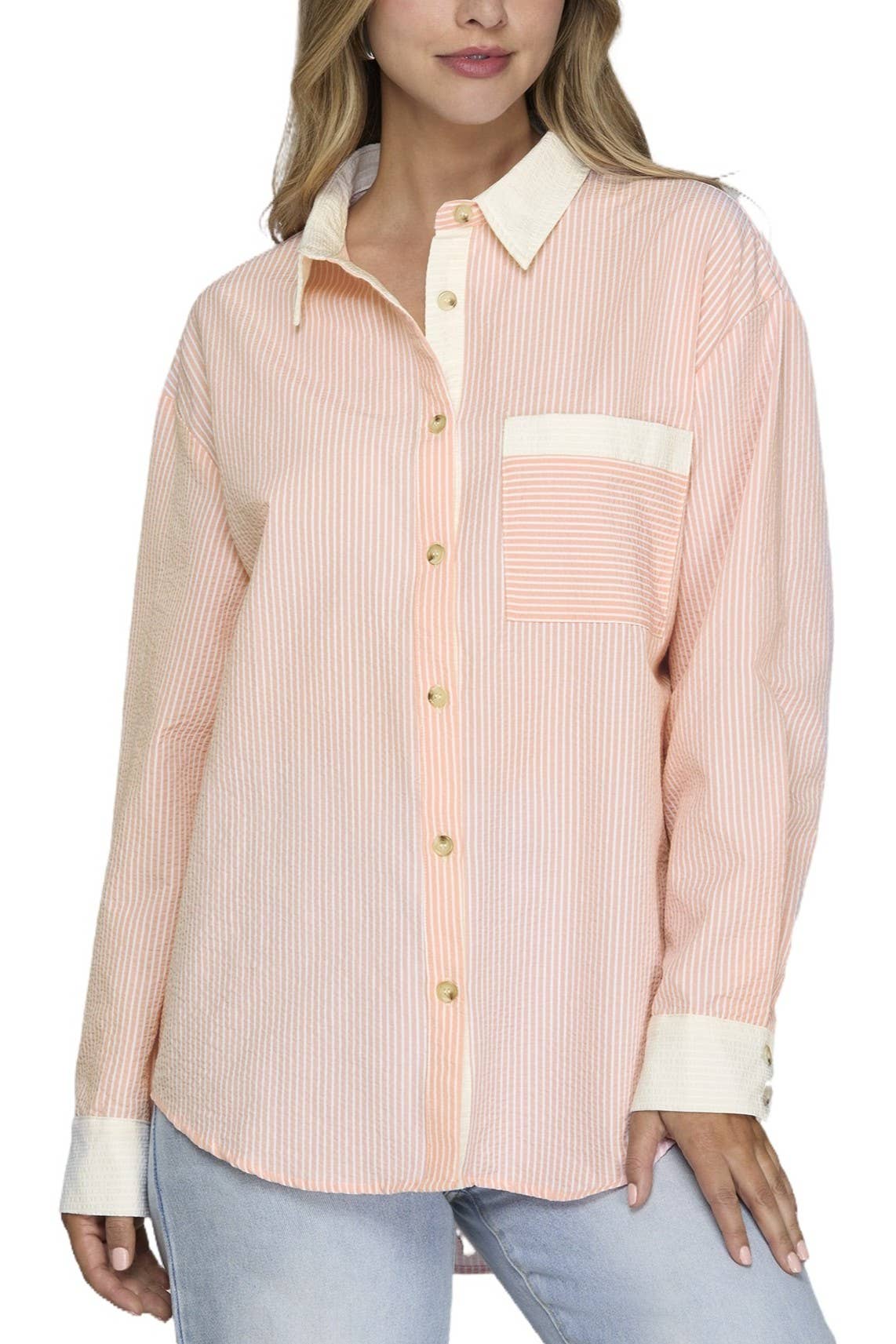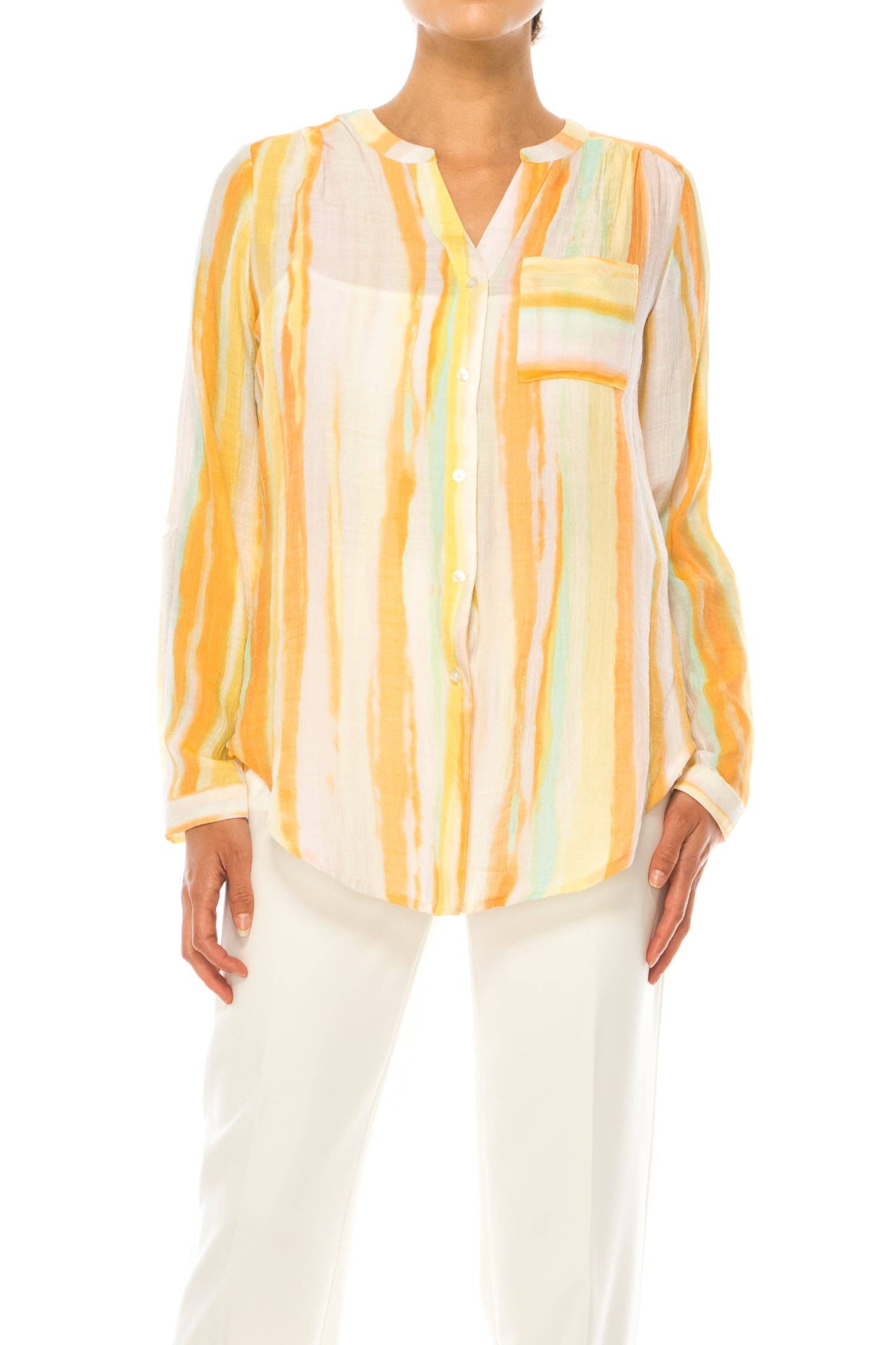 Add this classic-looking, lightweight button-up shirt that features a spread collar, a button-down placket with iridescent buttons, two front-flap pockets, adjustable and foldable sleeves, and a pretty striped print that is needed for your wardrobe essentials when it comes to going to work, date nights, and casual outings that pairs nicely with trousers, skirts, suits and jeans. Additional Details: - Care: Machine Wash Cold Tencel (100% Tencel) Style: TS186821