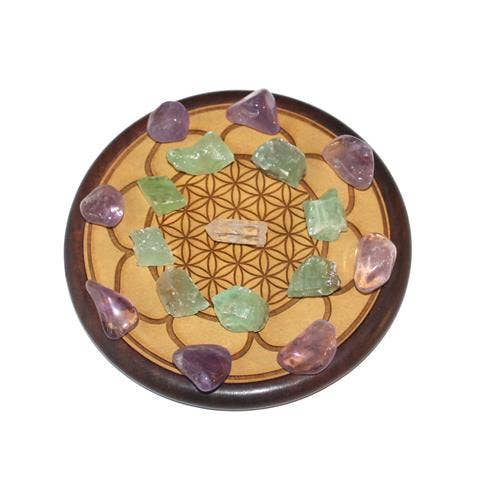 CRYSTAL GRID- Protection stones of wisdom – Gem Therapy A Crystal grid is a structure in which you can place gems according to a certain set-up in relation to each other - the geometric pattern - so that they reinforce each other's effect. Every gemstone has its own vibration frequency. There are different types of grids and therefore different set-ups that each serve a different purpose. Grids are used as a tool to manifest something beautiful. You can send the bundled energy of the stones that you need. Think of cleaning a room, healing, acquiring prosperity, love or help with border control. In this grid you will find an arrangement that contributes to protection. In addition, you will receive the set of gems that contribute to this intention: citrine, tiger eye, black onyx and rock crystal. Use Grid:In the middle you always place your main stone. This is often the biggest stone.