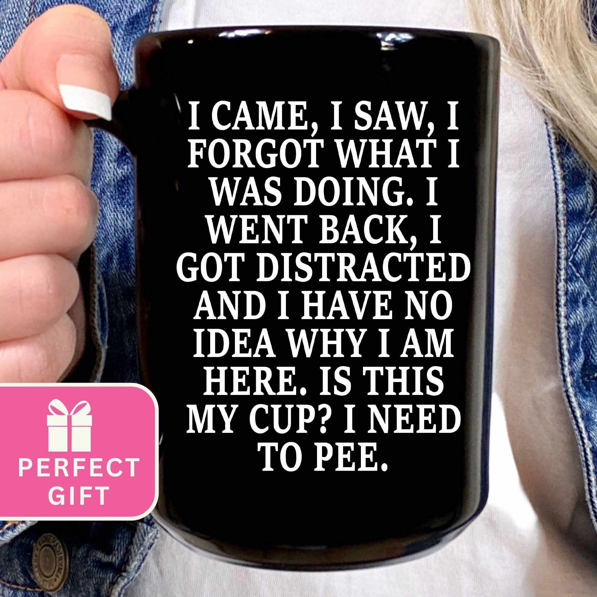 I came. I Saw. I forgot what I was doing. Retraced my steps, got distracted on my way back and have no idea what's going on. Is this my cup? And now I have to pee. Back reads: I swear I have it all together. I just forgot where I put it. Celebrate that getting older is not for sissies with this funny mug. Created in my New Jersey studio from stoneware clay and kiln fired to over 1900 degrees. This mug measures 4 x 4 and holds 16 oz. All glazes are lead free and non toxic. This item may be placed in the dishwasher or microwave- made to be used and enjoyed. over the hill old age new middle aged I came I saw funny mug forgetful 50th birthday 40th birthday 30th birthday