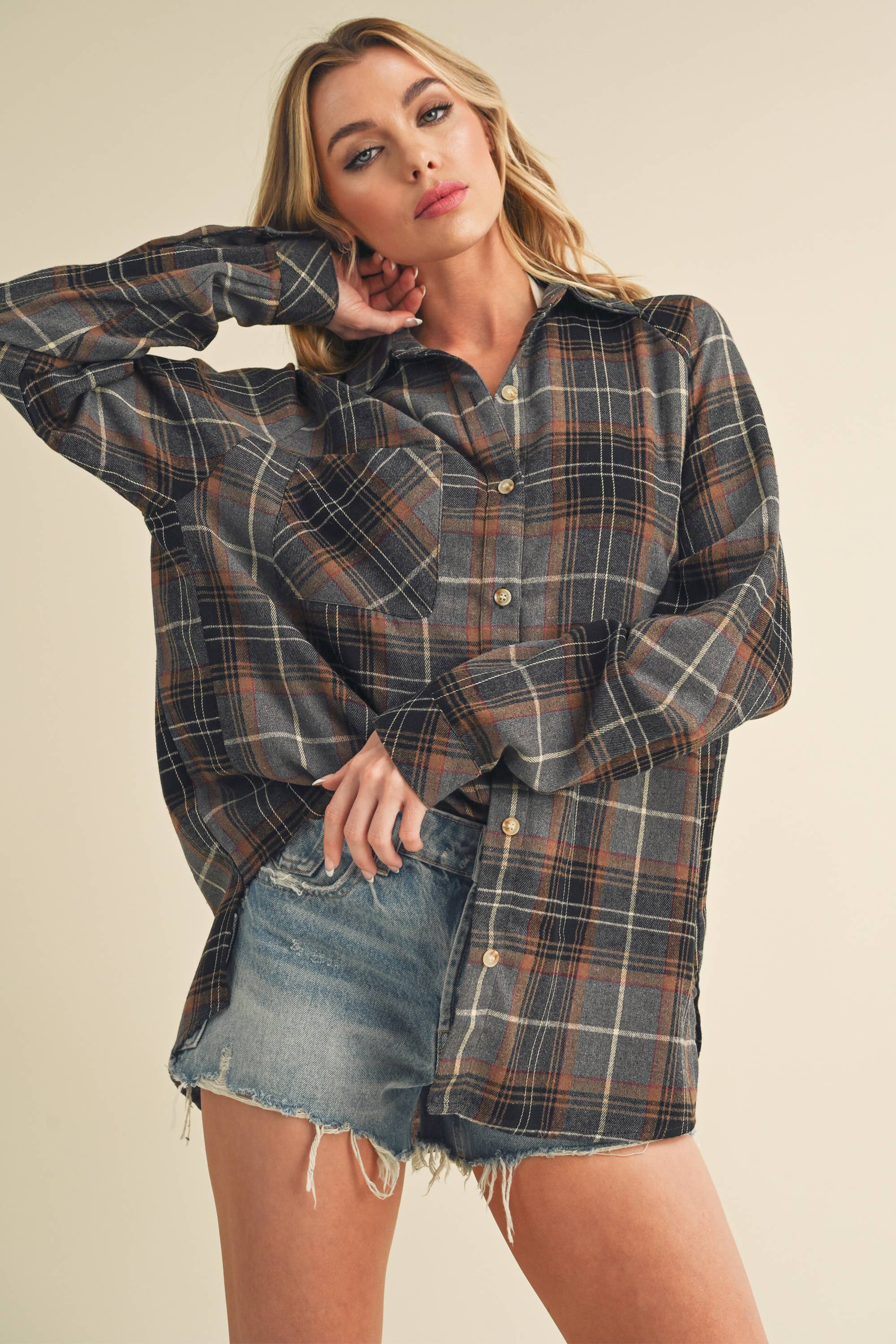 A relaxed fit, button down shirt showcasing a classic gingham print and pointed collar. Featuring a chest patch pocket and button-front closure, this long sleeve shirt works as both a lightweight top and an easy spring to summer layer. Style it with denim shorts, jeans, or skirts for an effortless, everyday look. MT1595 contemporary, coverup, checker, plaid, loose fit, womens top, gingham shirt, oversized shirt, button down shirt, plaid top, checker print, relaxed fit, lightweight layer, fall transition, fall shirt, winter layering, casual coverup, womens top, everyday shirt, vacation style, coastal fashion, Easter outfit, fall fashion, preppy layers, soft button down, fall 2025