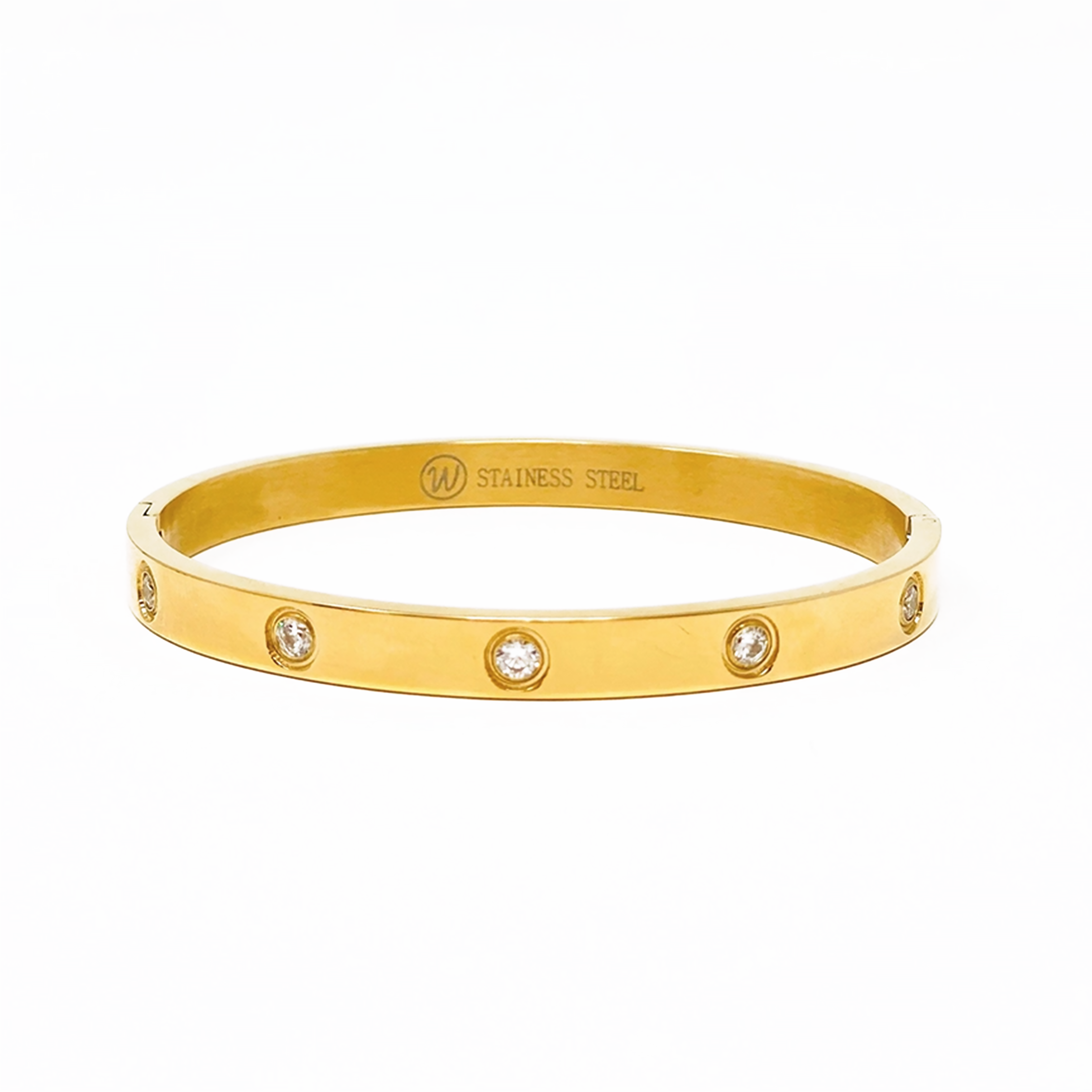 Check out this stunning Cubic Zirconia Hinged Stainless Steel Bangle for a luxurious gleam and a timeless look. Adorn yourself in elegance with this exquisite piece! Water Resistant Hinged Closure (apply light pressure to open & close) Inner circumference: 6.5" Inner measurements: 2.4" x 1.9" 18k Gold Plated Stainless Steel (or) Polished Stainless Steel Cubic Zirconia
