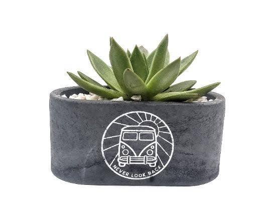 Our "Never Look Back" VW Bus Planter is the perfect addition to your succulent or small plant garden! Each planter is handmade with concrete and the inside of the planter sealed to ensure lime from leaching into the soil of your plants. These can be placed inside or outside the home! Each item is made to order by me ❤️️ so there will be a slight variation in the coloring and sizes of the final products, although I do my best to exceed your expectations! Thank you for visiting my shop and if you would like to see other designs we have available - check out the other planters and items in our shop! 🌿 DIMENSIONS 6.5 x 3.15 x 2.95 inches *Plants Not Included