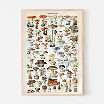Art print featuring a rainbow of over 80 mushroom varieties. Original gouache paintings assembled in a colorful oversize format. Printed in Minneapolis on acid free 80# Mohawk Superfine cover. Packed with .024 inch chipboard backing in clear sleeve, ready for display.