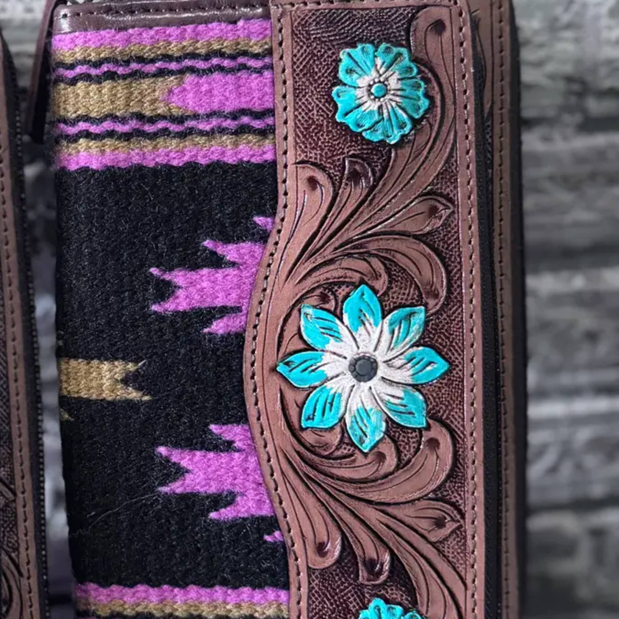 Indulge in luxury with the Scarlet, sunflower wallet. This bi-folding wallet features a vibrant red stained leather and is adorned with intricate sunflower tooling. The cowhide back and partially tooled leather front add durability and sophistication. Stay secure with the convenient snap closure.